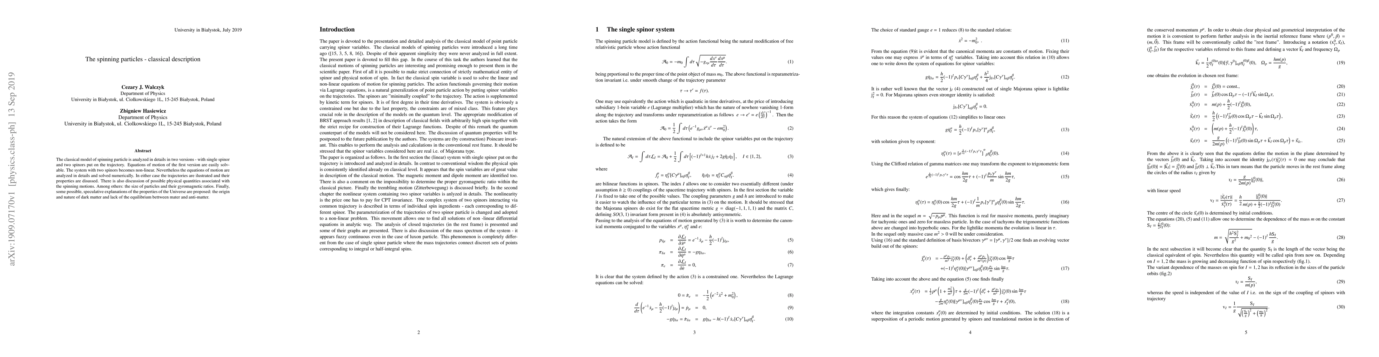 This paper analyzes classical models of spinning particles in two versions, solving the equations of motion for the single spinor model and solving them numerically for the more complex two spinor model. It discusses physical quantities like particle size and gyromagnetic ratios, and speculates on the origin of dark matter and the imbalance between matter and antimatter.