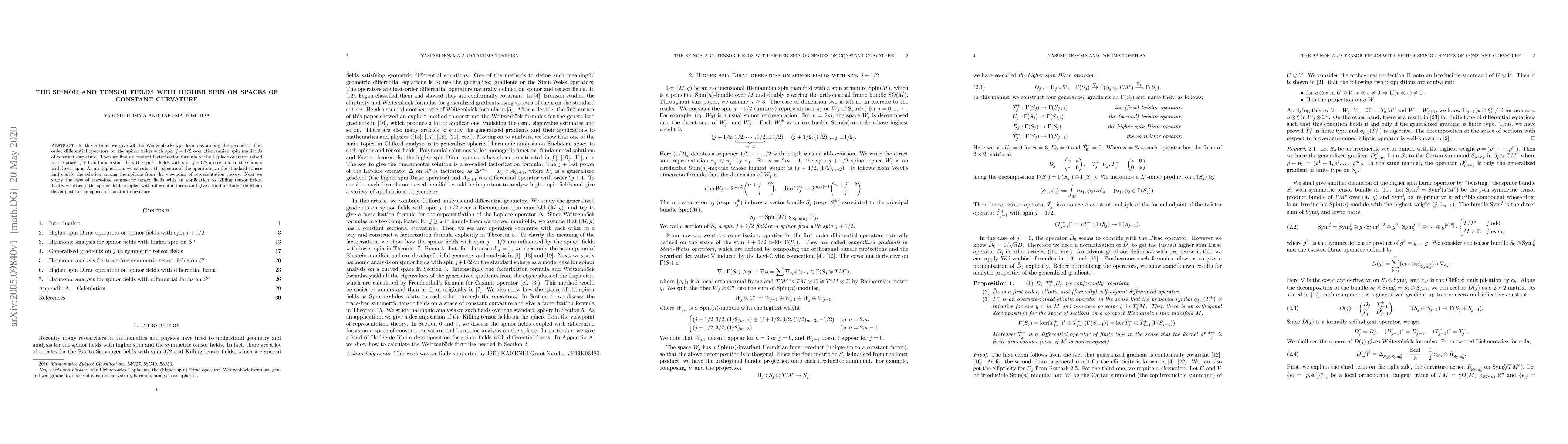 This paper derives Weitzenböck-type formulas for geometric first-order differential operators on spinor fields with spin $j+1/2$ over Riemannian spin manifolds with constant curvature, and provides a factorization of the Laplace operator raised to the power $j+1$. It also explores the spectra of these operators on the standard sphere and examines the relationship between tensor fields and Killing tensor fields.