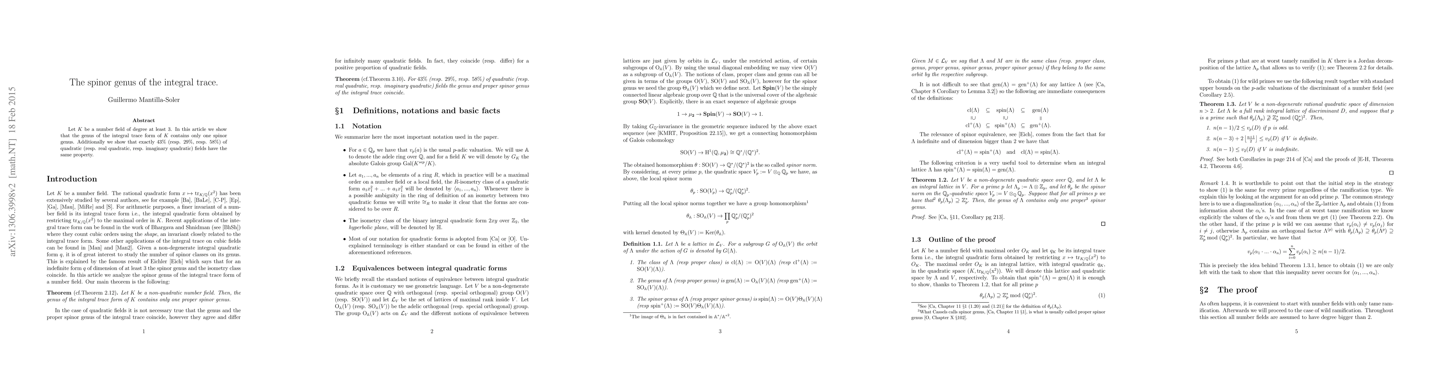 Let $K$ be a number field of degree at least $3$. In this article we show that the genus of the integral trace form of $K$ contains only one spinor genus. Additionally we show that exactly $43%$ (resp. $29%$, resp. $58%$) of quadratic (resp. real quadratic, resp. imaginary quadratic) fields have the same property.