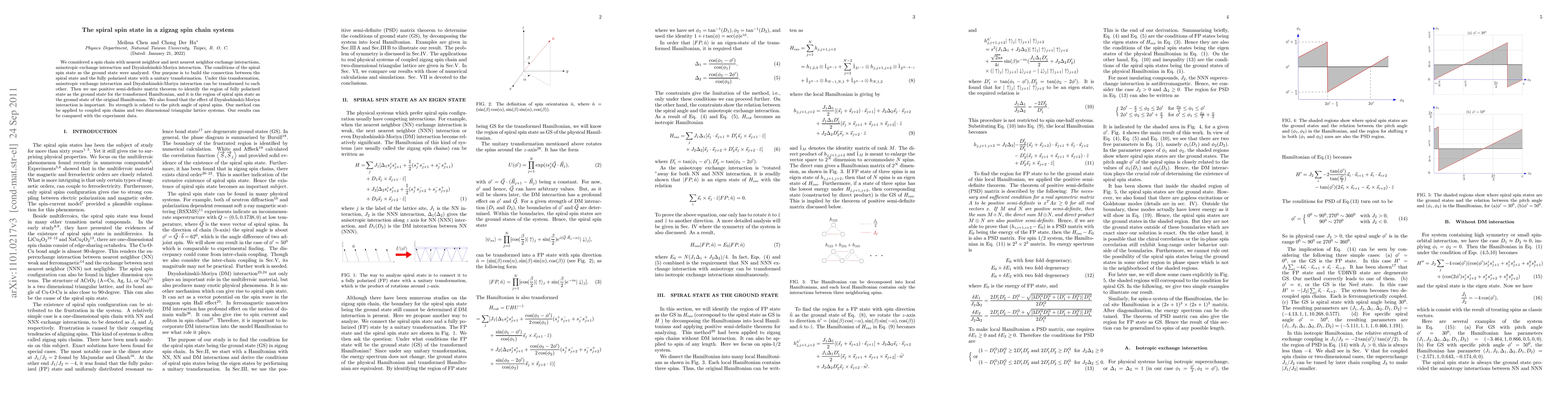 We considered a spin chain with nearest neighbor and next nearest neighbor exchange interactions, anisotropic exchange interaction and Dzyaloshinskii-Moriya interaction. The conditions of the spiral spin state as the ground state were analyzed. Our method was to build the connection between the spiral state and the fully polarized state with a unitary transformation. Under this transformation, anisotropic exchange interaction and Dzyaloshinskii-Moriya interaction can be transformed to each other. Then we used positive semi-definite matrix theorem to identify the region of fully polarized state as the ground state for the transformed Hamiltonian, and it is the region of spiral spin state as the ground state of the original Hamiltonian. We also found that the effect of Dzyaloshinskii-Moriya interaction is important. Its strength is related to the pitch angle of spiral spins. Our method can be applied to coupled spin chains and two dimensional triangular lattice systems. The result can be compared with experiment data.