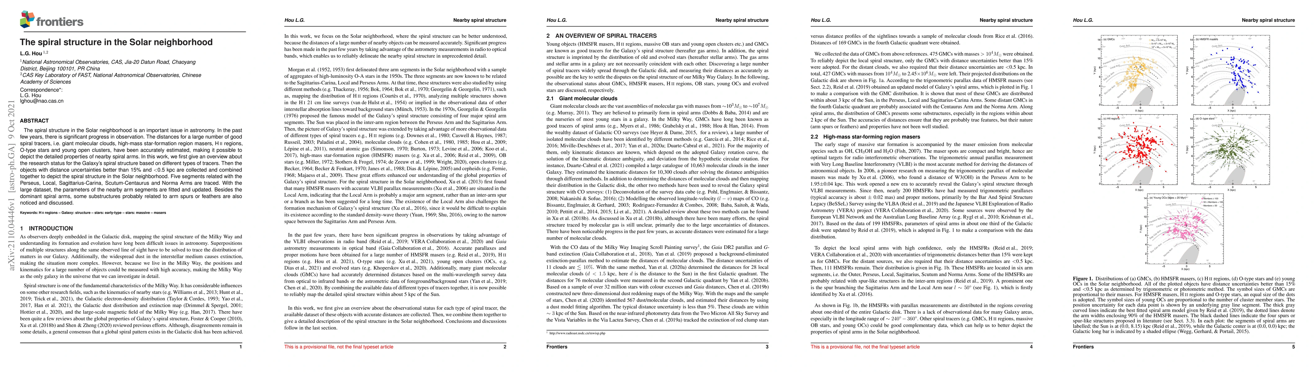 This paper reviews the current state of research on the spiral structure in the Solar neighborhood, utilizing accurate distance measurements for various tracers to depict the detailed properties of nearby spiral arms. The study identifies and fits parameters for five major arm segments and discusses potential substructures within the spiral arms.