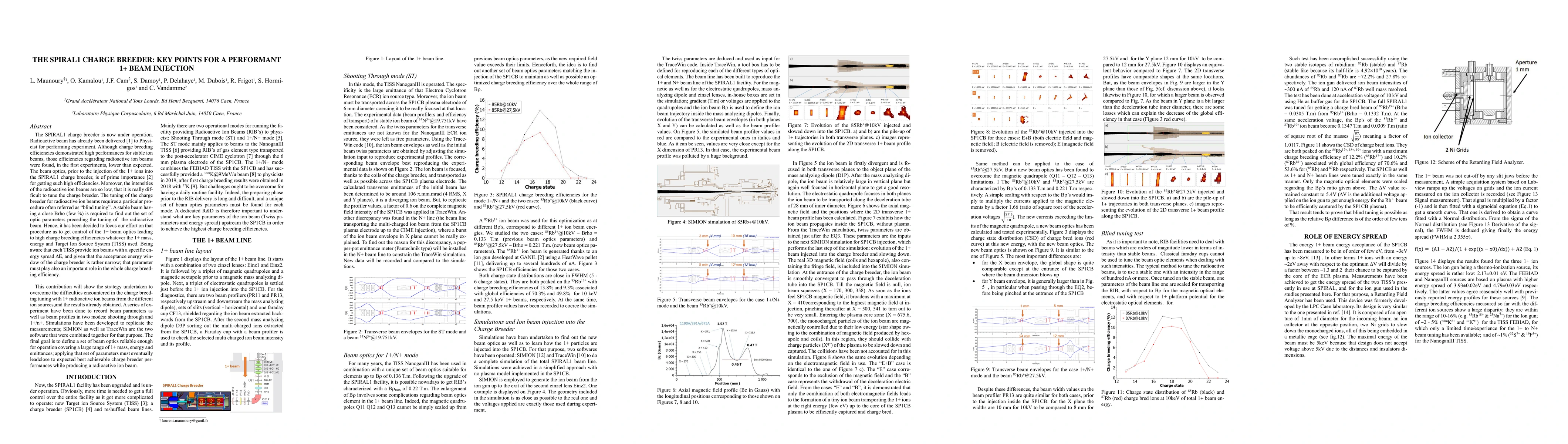 The SPIRAL1 charge breeder is now under operation. Radioactive beam has already been delivered [1] to Physicist for performing experiment. Although charge breeding efficiencies demonstrated high performances for stable ion beams, those efficiencies regarding radioactive ion beams were found, in the first experiments, lower than expected. The beam optics, prior to the injection of the 1+ ions into the SPIRAL1 charge breeder, is of prime importance [2] for getting such high efficiencies. Moreover, the intensities of the radioactive ion beams are so low, that it is really difficult to tune the charge breeder. The tuning of the charge breeder for radioactive ion beams requires a particular procedure often referred as blind tuning. A stable beam hav-ing a close Brho (few percent) is required to find out the set of optic parameters preceding the tuning of the radioactive beam. Hence, it has been decided to focus our effort on that procedure as to get control of the 1+ beam optics leading to high charge breeding efficiencies whatever the 1+ mass, energy and Target Ion Source System (TISS) used. Being aware that each TISS provide ion beams with a specific energy spread DeltaE, and given that the acceptance energy win-dow of the charge breeder is rather narrow; that parameter must play also an important role in the whole charge breed-ing efficiency.