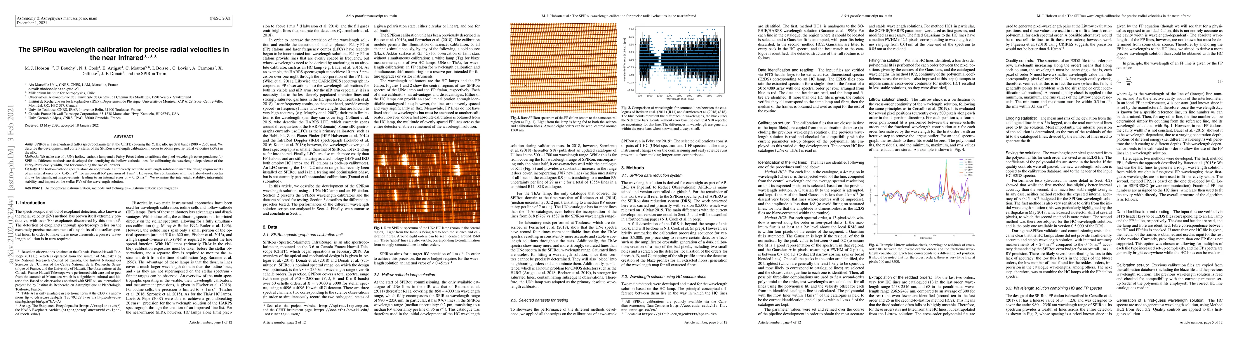 SPIRou, a near-infrared spectropolarimeter, employs a UNe hollow-cathode lamp and a Fabry-Pérot étalon for precise radial velocity calibration, achieving an internal error of ~0.15 m/s. The combination of these methods significantly improves the wavelength calibration over the use of the hollow-cathode alone.