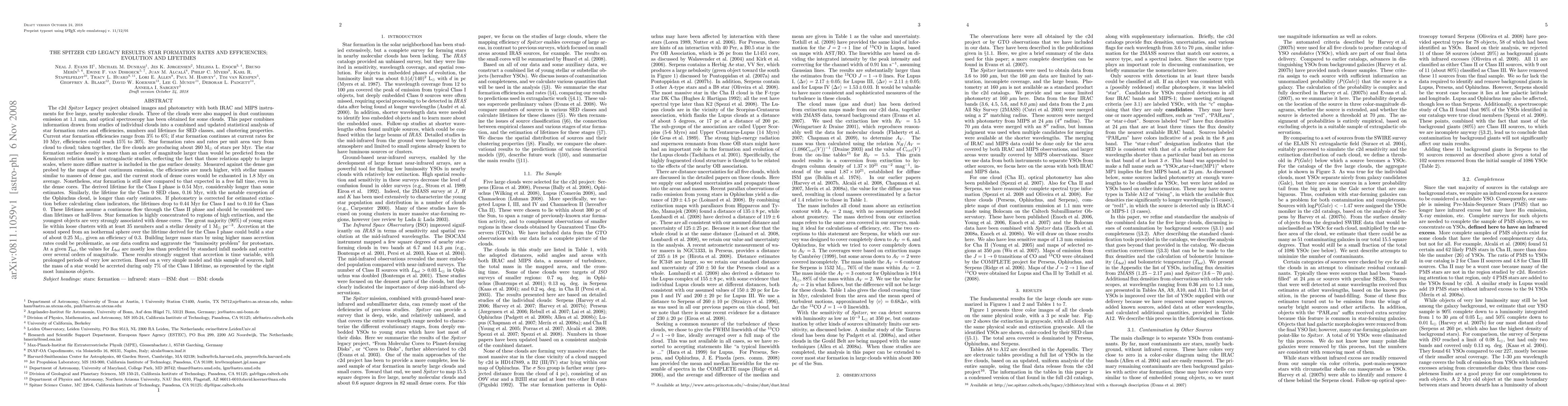 (Abridged) The c2d Spitzer Legacy project obtained images and photometry with both IRAC and MIPS instruments for five large, nearby molecular clouds. This paper combines information drawn from studies of individual clouds into a combined and updated statistical analysis of star formation rates and efficiencies, numbers and lifetimes for SED classes, and clustering properties. Current star formation efficiencies range from 3% to 6%. Taken together, the five clouds are producing about 260 solar masses of stars per Myr. The star formation surface density is more than an order of magnitude larger than would be predicted from the Kennicutt relation used in extragalactic studies. Measured against the dense gas probed by the maps of dust continuum emission, the efficiencies are much higher, and the current stock of dense cores would be exhausted in 1.8 Myr on average. The derived lifetime for the Class I phase is 0.44 to 0.54 Myr, considerably longer than some estimates. Similarly, the lifetime for the Class 0 SED class, 0.10 to 0.16 Myr, is longer than early estimates. The great majority (90%) of young stars lie within loose clusters with at least 35 members and a stellar density of 1 solar mass per cubic pc. Accretion at the sound speed from an isothermal sphere over the lifetime derived for the Class I phase could build a star of about 0.25 solar masses, given an efficiency of 0.3. Our data confirm and aggravate the "luminosity problem" for protostars. Our results strongly suggest that accretion is time variable, with prolonged periods of very low accretion. Based on a very simple model and this sample of sources, half the mass of a star would be accreted during only 7% of the Class I lifetime, as represented by the eight most luminous objects.