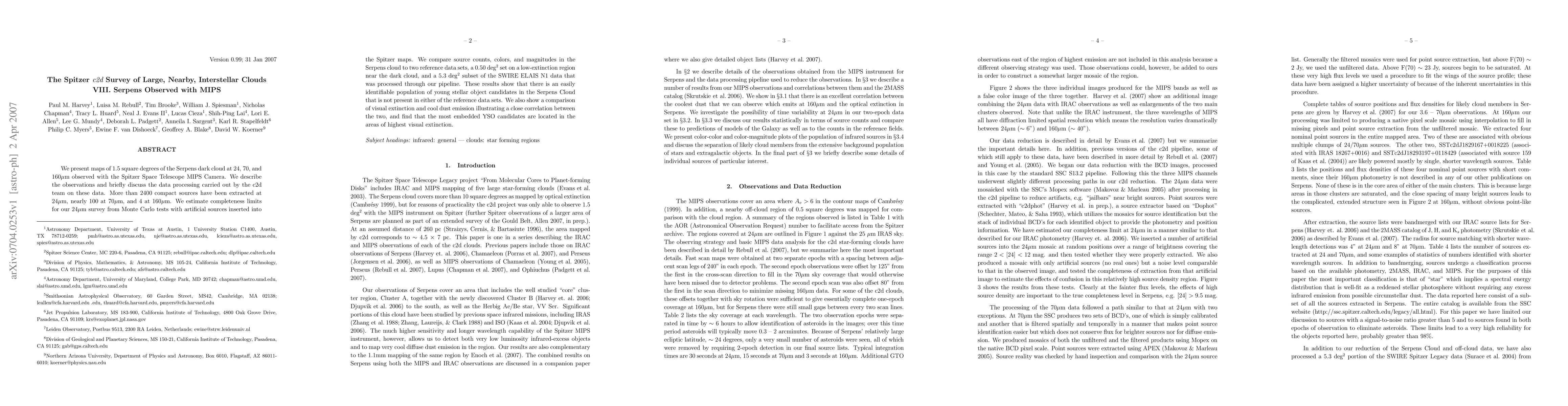 This study uses Spitzer Space Telescope MIPS data to map the Serpens dark cloud, identifying over 2400 compact sources at 24µm and revealing a distinct population of young stellar objects not found in comparison datasets. The research also correlates visual extinction with cool dust emission, indicating that the most embedded YSO candidates are in regions of highest visual extinction.