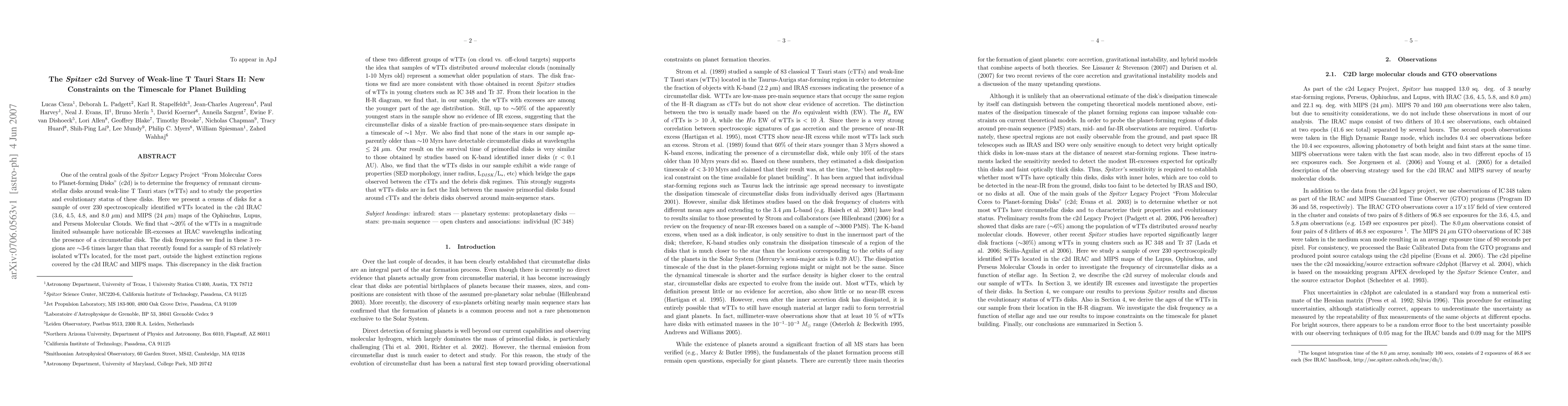 This study from the Spitzer c2d Survey identifies disks around weak-line T Tauri stars (wTTs) in molecular clouds, finding that ~20% exhibit infrared excesses, indicating circumstellar disks. The results suggest that the timescale for disk dissipation is approximately 1 Myr, with no detectable disks in stars older than ~10 Myrs.