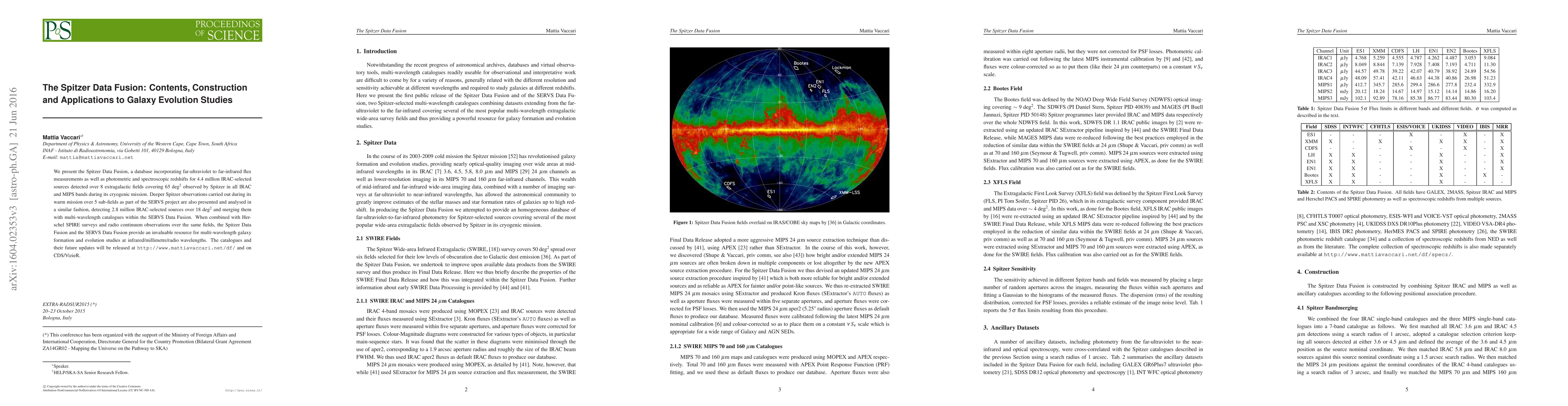 We present the Spitzer Data Fusion, a database incorporating far-ultraviolet to far-infrared flux measurements as well as photometric and spectroscopic redshifts for 4.4 million IRAC-selected sources detected over 8 extragalactic fields covering 65 deg$^2$ observed by Spitzer in all IRAC and MIPS bands during its cryogenic mission. Deeper Spitzer observations carried out during its warm mission over 5 sub-fields as part of the SERVS project are also presented and analysed in a similar fashion, detecting 2.8 million IRAC-selected sources over 18 deg$^2$ and merging them with multi-wavelength catalogues within the SERVS Data Fusion. When combined with Herschel SPIRE surveys and radio continuum observations over the same fields, the Spitzer Data Fusion and the SERVS Data Fusion provide an invaluable resource for multi-wavelength galaxy formation and evolution studies at infrared/millimetre/radio wavelengths. The catalogues and their future updates will be released at http://www.mattiavaccari.net/df/ and on CDS/VizieR.
