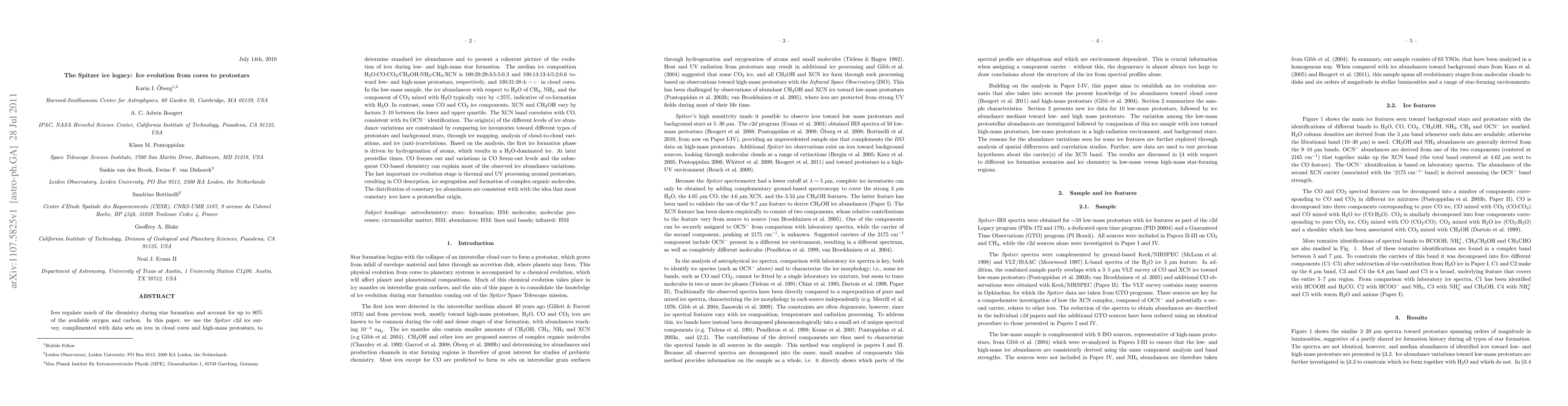 This paper uses Spitzer data to analyze the evolution of ices during star formation, revealing that ices play a crucial role in chemistry, with H2O dominating early ice formation. Variations in ice abundances are largely driven by CO freeze-out and subsequent CO-based chemistry, with later stages influenced by thermal and UV processing around protostars.