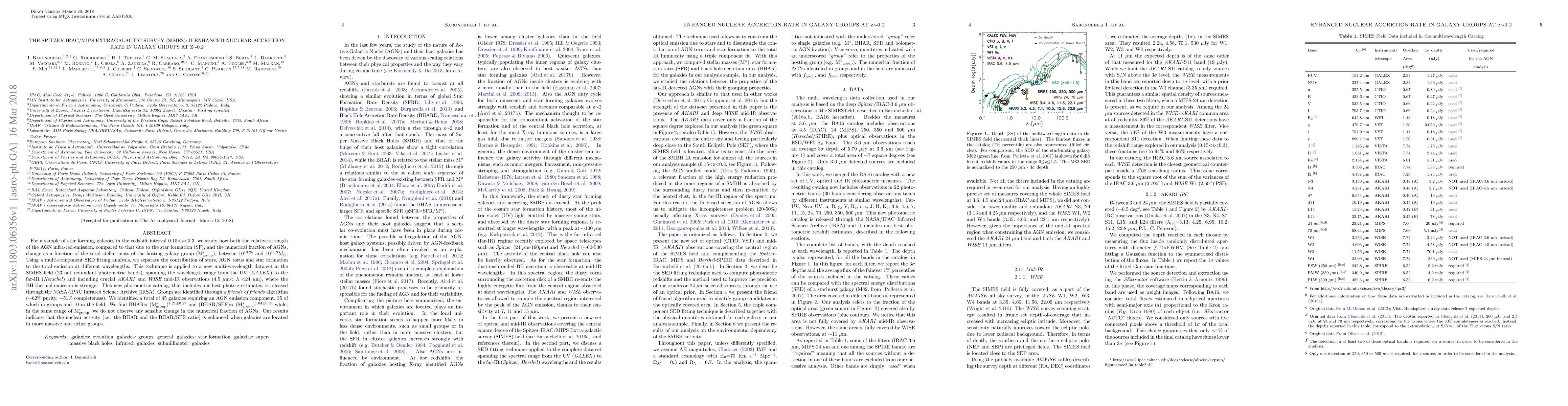 For a sample of star forming galaxies in the redshift interval 0.15$<$z$<$0.3, we study how both the relative strength of the AGN infra-red emission, compared to that due to the star formation (SF), and the numerical fraction of AGNs, change as a function of the total stellar mass of the hosting galaxy group (M$^{*}_{\mathrm{group}}$), between $10^{10.25}$ and $10^{11.9}$M$_{\odot}$. Using a multi-component SED fitting analysis, we separate the contribution of stars, AGN torus and star formation to the total emission at different wavelengths. This technique is applied to a new multi-wavelength data-set in the SIMES field (23 not redundant photometric bands), spanning the wavelength range from the UV (GALEX) to the far-IR (Herschel) and including crucial AKARI and WISE mid-IR observations (4.5 \mu m$<\lambda<$24 \mu m), where the BH thermal emission is stronger. This new photometric catalog, that includes our best photo-z estimates, is released through the NASA/IPAC Infrared Science Archive (IRSA). Groups are identified through a friends of friends algorithm ($\sim$62% purity, $\sim$51% completeness). We identified a total of 45 galaxies requiring an AGN emission component, 35 of which in groups and 10 in the field. We find BHAR$\propto ($M$^{*}_{\mathrm{group}})^{1.21\pm0.27}$ and (BHAR/SFR)$\propto ($M$^{*}_{\mathrm{group}})^{1.04\pm0.24}$ while, in the same range of M$^{*}_{\mathrm{group}}$, we do not observe any sensible change in the numerical fraction of AGNs. Our results indicate that the nuclear activity (i.e. the BHAR and the BHAR/SFR ratio) is enhanced when galaxies are located in more massive and richer groups.