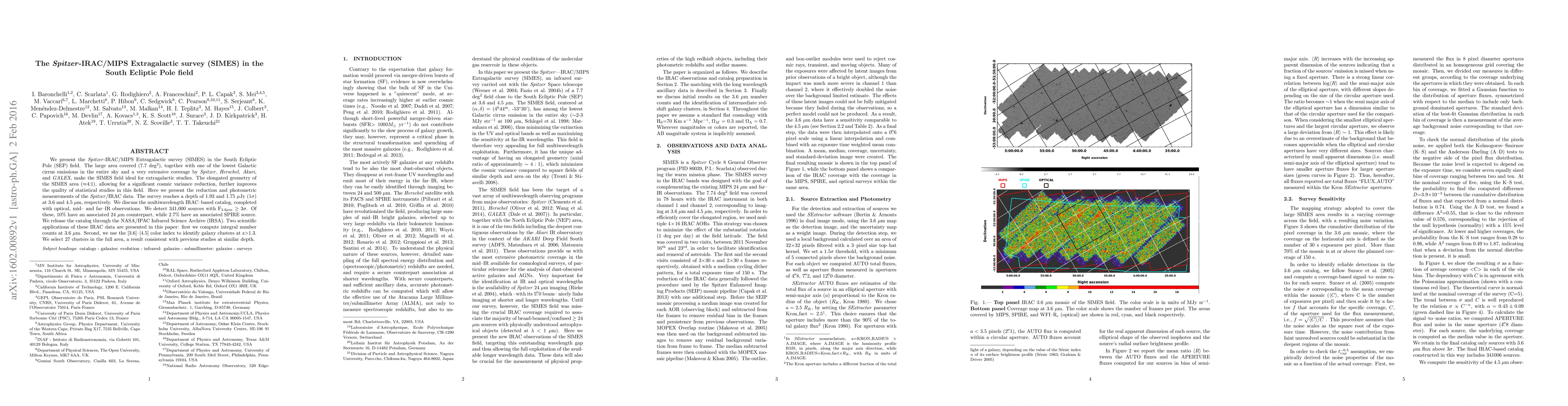 The research presents the Spitzer-IRAC/MIPS Extragalactic survey (SIMES) in the South Ecliptic Pole (SEP) field, utilizing multiwavelength data from Spitzer, Herschel, Akari, and GALEX. It covers 7.7 deg^2 with a depth of 1.93 and 1.75 μJy (1σ) at 3.6 and 4.5 μm, respectively, enabling extragalactic studies with reduced cosmic variance.