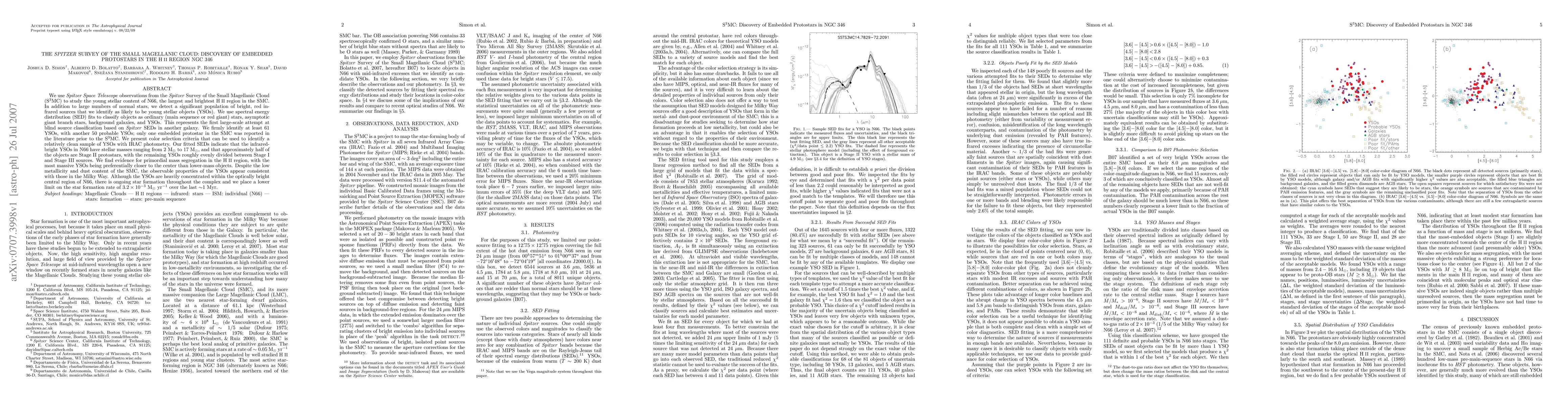The Spitzer Survey of the Small Magellanic Cloud discovered a significant population of young stellar objects (YSOs) in the HII region NGC 346, identifying at least 61 confirmed YSOs and 50 probable ones, marking a substantial increase over previous findings. The study reveals ongoing star formation and indicates primordial mass segregation, with the most massive YSOs located closer to the center.