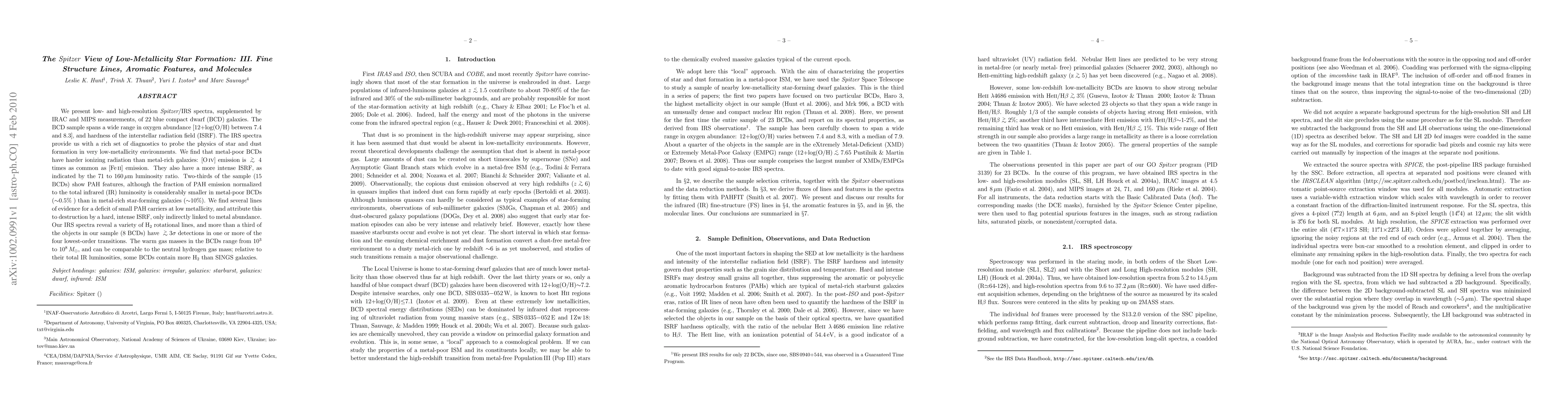 We present low- and high-resolution Spitzer/IRS spectra, supplemented by IRAC and MIPS measurements, of 22 blue compact dwarf (BCD) galaxies. The BCD sample spans a wide range in oxygen abundance [12+Log(O/H) between 7.4 and 8.3], and hardness of the interstellar radiation field (ISRF). The IRS spectra provide us with a rich set of diagnostics to probe the physics of star and dust formation in very low-metallicity environments. We find that metal-poor BCDs have harder ionizing radiation than metal-rich galaxies: [OIV] emission is roughly 4 times as common as [FeII] emission. They also have a more intense ISRF, as indicated by the 71 to 160micron luminosity ratio. Two-thirds of the sample (15 BCDs) show PAH features, although the fraction of PAH emission normalized to the total infrared (IR) luminosity is considerably smaller in metal-poor BCDs (~0.5%) than in metal-rich star-forming galaxies (~10%). We find several lines of evidence for a deficit of small PAH carriers at low metallicity, and attribute this to destruction by a hard, intense ISRF, only indirectly linked to metal abundance. Our IRS spectra reveal a variety of H2 rotational lines, and more than a third of the objects in our sample (8 BCDs) have >=3sigma detections in one or more of the four lowest-order transitions. The warm gas masses in the BCDs range from 10^3 to 10^8 Msun, and can be comparable to the neutral hydrogen gas mass; relative to their total IR luminosities, some BCDs contain more H2 than SINGS galaxies.