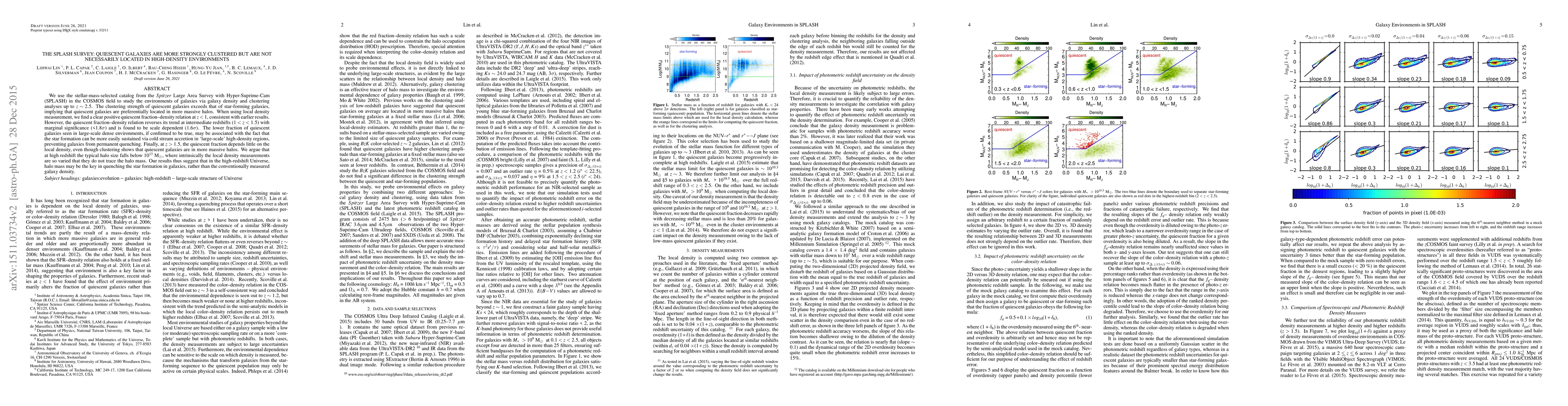 We use the stellar-mass-selected catalog from the Spitzer Large Area Survey with Hyper-Suprime-Cam (SPLASH) in the COSMOS field to study the environments of galaxies via galaxy density and clustering analyses up to $z \sim 2.5$. The clustering strength of quiescent galaxies exceeds that of star-forming galaxies, implying that quiescent galaxies are preferentially located in more massive halos. When using local density measurement, we find a clear positive quiescent fraction--density relation at $z < 1$, consistent with earlier results. However, the quiescent fraction--density relation reverses its trend at intermediate redshifts ($1 < z < 1.5$) with marginal significance (<1.8$\sigma$) and is found to be scale dependent (1.6$\sigma$). The lower fraction of quiescent galaxies seen in large-scale dense environments, if confirmed to be true, may be associated with the fact that the star formation can be more easily sustained via cold stream accretion in `large-scale' high-density regions, preventing galaxies from permanent quenching. Finally, at $z > 1.5$, the quiescent fraction depends little on the local density, even though clustering shows that quiescent galaxies are in more massive halos. We argue that at high redshift the typical halo size falls below $10^{13}$ $M_{\odot}$, where intrinsically the local density measurements are so varied that they do not trace the halo mass. Our results thus suggest that in the high-redshift Universe, halo mass may be the key in quenching the star formation in galaxies, rather than the conventionally measured galaxy density.