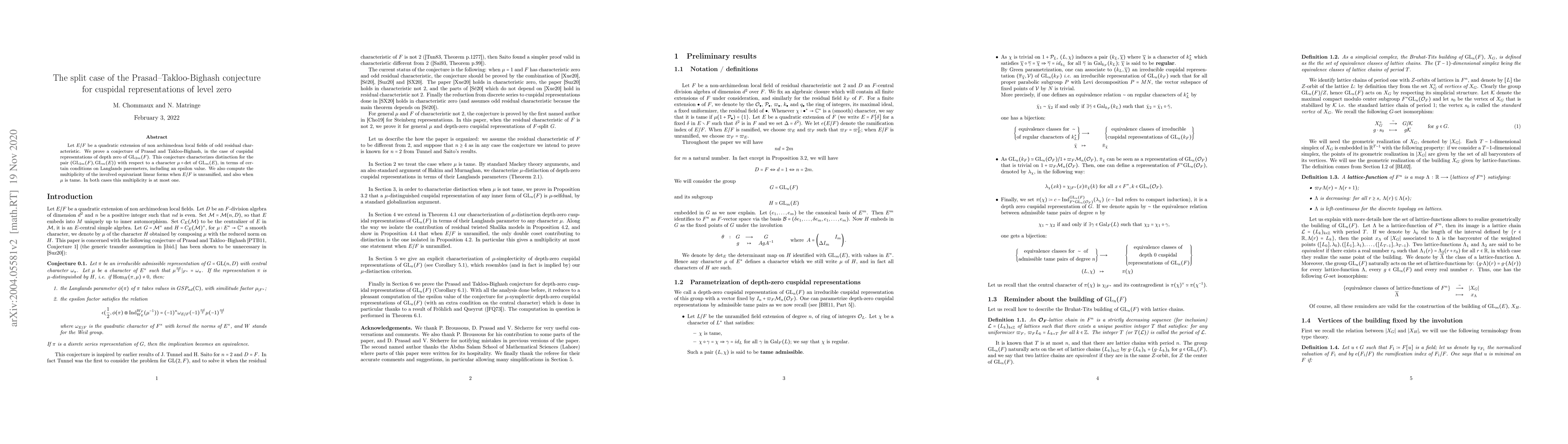 This paper proves the Prasad--Takloo-Bighash conjecture for cuspidal representations of $\mathrm{GL}(2m,F)$ at level zero, characterizing distinction with respect to $\mathrm{GL}(m,E)$ via Langlands parameters. It also determines the multiplicity of equivariant linear forms in unramified and tame cases, showing it is at most one.