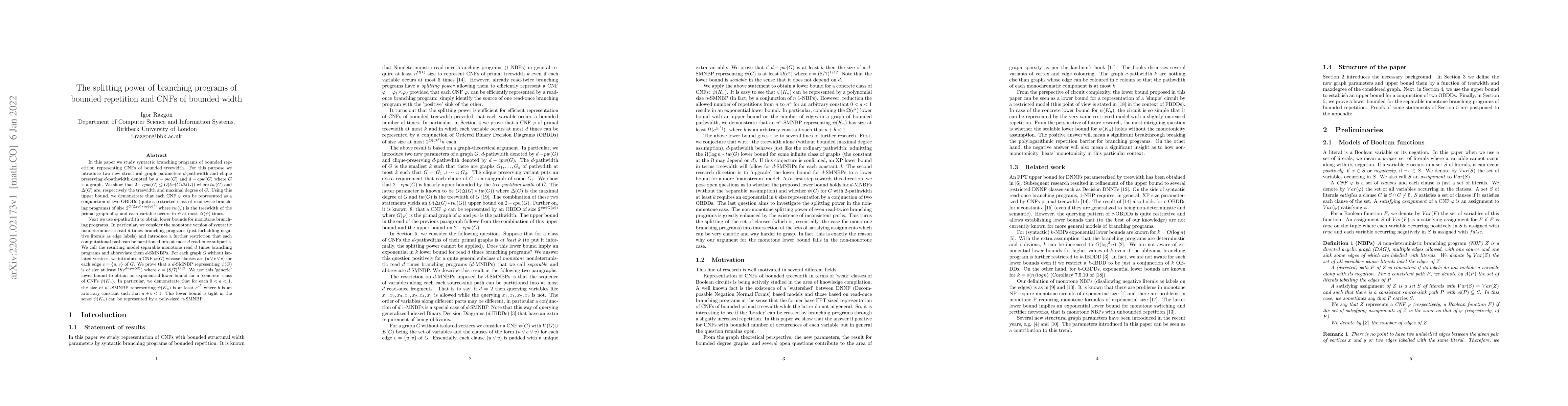 This paper introduces new structural graph parameters $d$-pathwidth and clique preserving $d$-pathwidth to analyze syntactic branching programs representing CNFs of bounded treewidth. It demonstrates that each CNF can be represented by two OBDDs of size $2^{O(\Delta(\psi) \cdot tw(\psi)^2)}$. It also establishes lower bounds for separable monotone read $d$ times branching programs, showing that for certain CNFs, their size is at least $\Omega(c^{d-pw(G)})$, leading to an exponential lower bound for a specific class of CNFs.