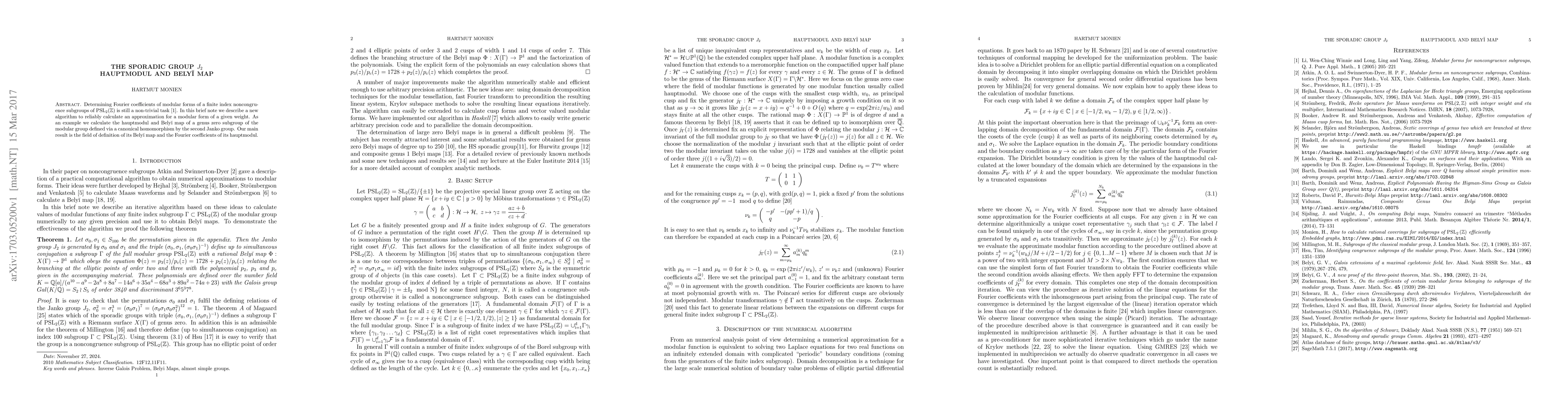 Determining Fourier coefficients of modular forms of a finite index noncongruence subgroups of the modular group is still a non-trivial task. In this brief note we describe a new algorithm to reliably calculate an approximation for a modular form of a given weight. As an example we calculate the hauptmodul and Belyi map of a genus zero subgroup of the modular group defined via a canonical homomorphism by the second Janko group. Our main result is the field of definition of its Belyi map, the explicit Belyi map and the Fourier coefficients of its hauptmodul.