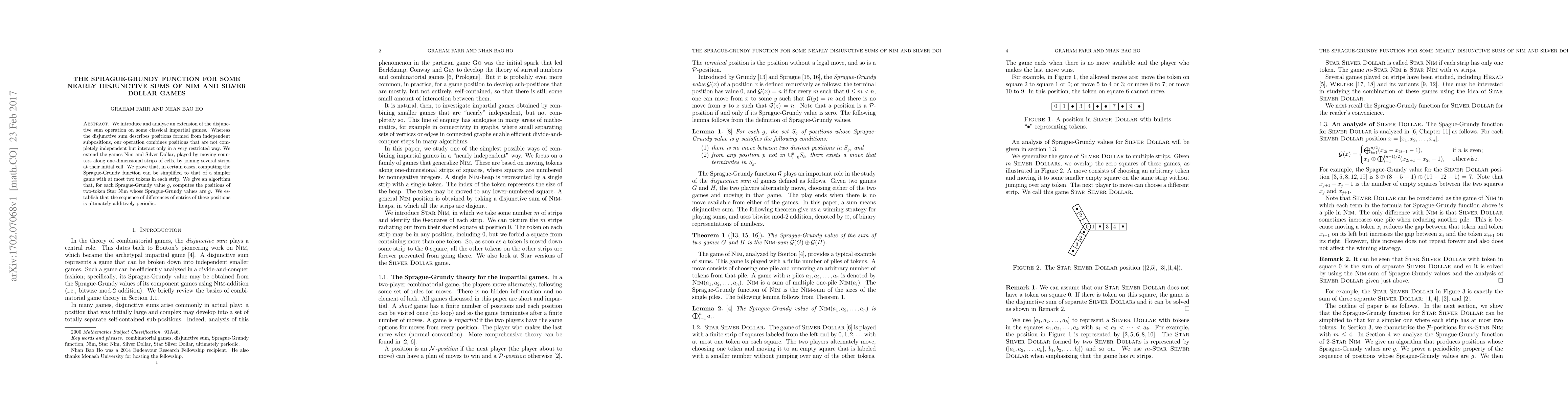 This paper extends the disjunctive sum operation to nearly disjunctive combinations of Nim and Silver Dollar games, where strips are joined at the initial cell. The authors simplify the computation of the Sprague-Grundy function for these games and provide an algorithm to determine positions of two-token Star Nim games with equivalent Sprague-Grundy values, showing that the sequence of differences of these values is ultimately periodic.