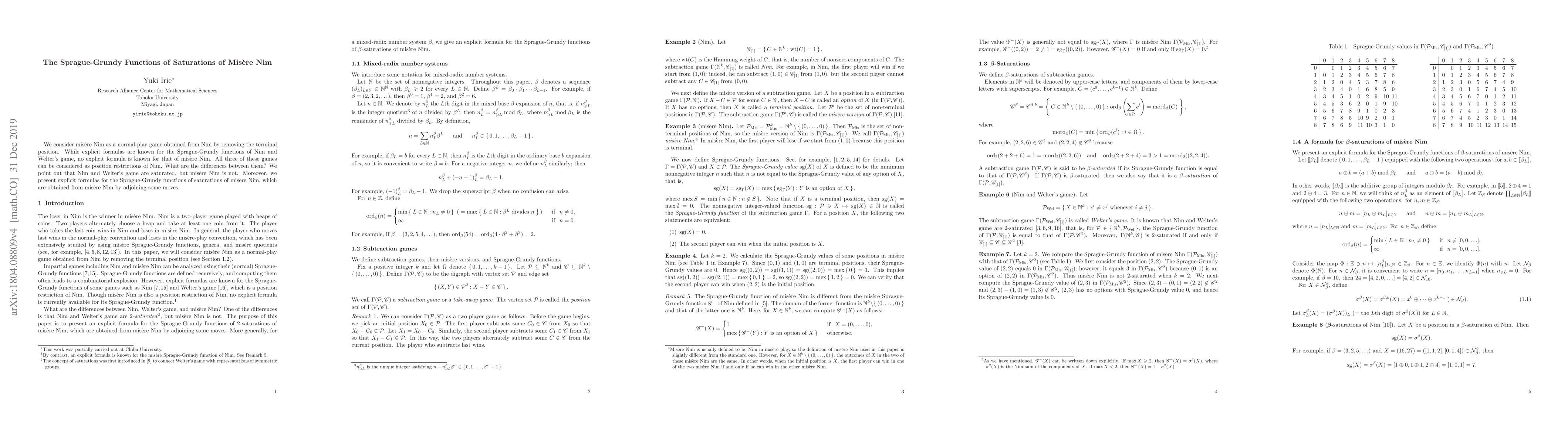 The paper presents explicit formulas for the Sprague-Grundy functions of saturations of mis\`ere Nim, obtained by adjoining moves to mis\`ere Nim, which is shown not to be saturated.