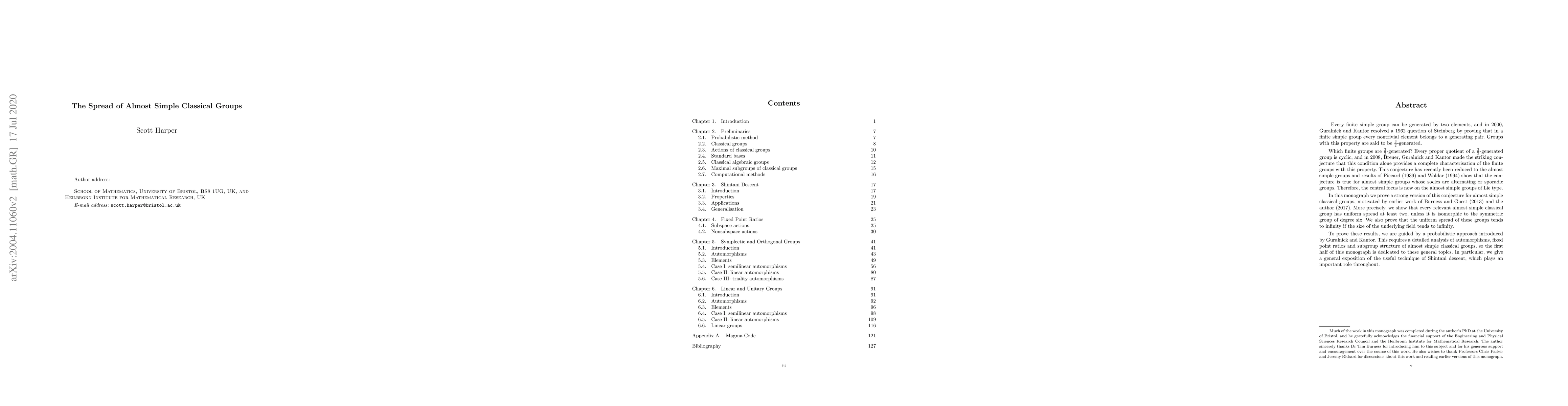 This paper proves a strong version of the conjecture that a finite group is $\frac{3}{2}$-generated if and only if every nontrivial element belongs to a generating pair, focusing on almost simple classical groups. The authors demonstrate that these groups have a uniform spread of at least two, with exceptions for the symmetric group of degree six, using a probabilistic approach and detailed subgroup analysis.