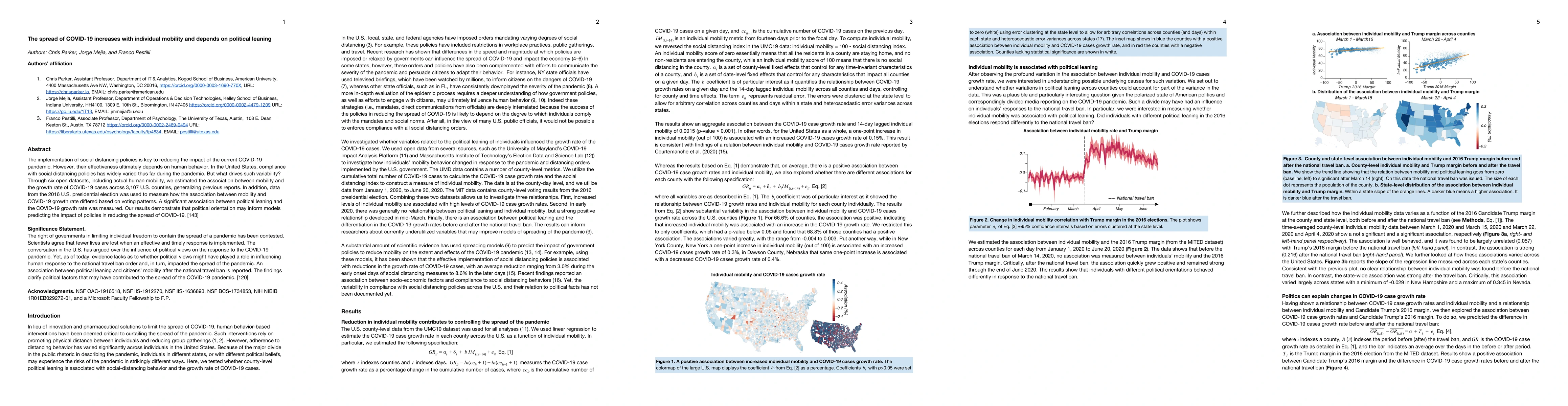 This study finds that individual mobility significantly correlates with the spread of COVID-19, and political leanings influence compliance with social distancing policies, thereby affecting the growth rate of COVID-19 cases across U.S. counties. Political orientation should be considered in models predicting the effectiveness of COVID-19 mitigation strategies.