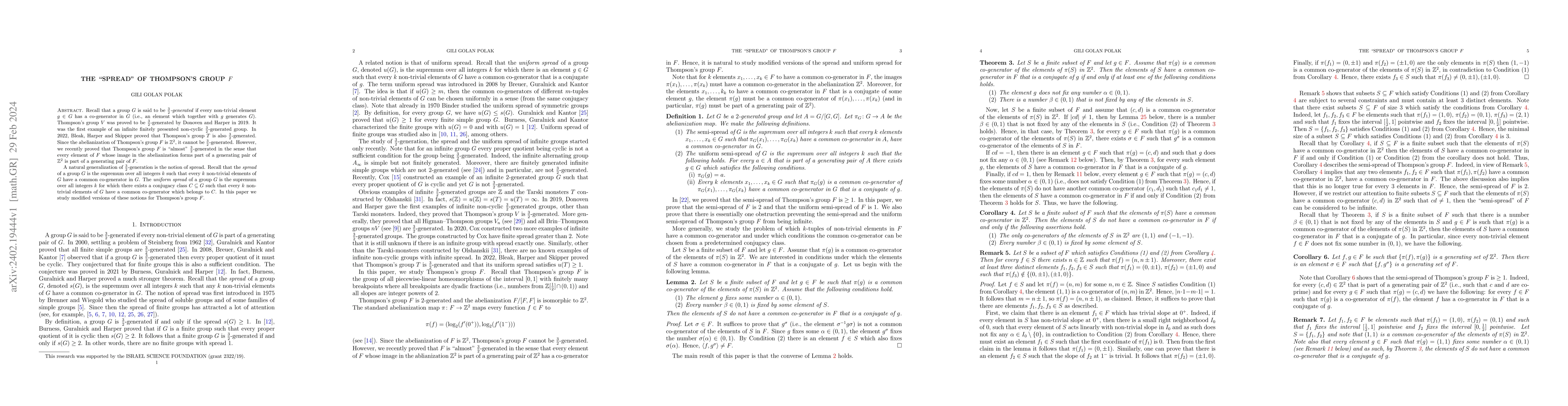 Recall that a group $G$ is said to be $\frac{3}{2}$-generated if every non-trivial element $g\in G$ has a co-generator in $G$ (i.e., an element which together with $g$ generates $G$). Thompson's group $V$ was proved to be $\frac{3}{2}$-generated by Donoven and Harper in 2019. It was the first example of an infinite finitely presented non-cyclic $\frac{3}{2}$-generated group. In 2022, Bleak, Harper and Skipper proved that Thompson's group $T$ is also $\frac{3}{2}$-generated. Since the abelianization of Thompson's group $F$ is $\mathbb{Z}$, it cannot be $\frac{3}{2}$-generated. However, we recently proved that Thompson's group $F$ is "almost" $\frac{3}{2}$-generated in the sense that every element of $F$ whose image in the abelianization forms part of a generating pair of $\mathbb{Z}^2$ is part of a generating pair of $F$. A natural generalization of $\frac{3}{2}$-generation is the notion of spread. Recall that the spread of a group $G$ is the supremum over all integers $k$ such that every $k$ non-trivial elements of $G$ have a common co-generator in $G$. The uniform spread of a group $G$ is the supremum over all integers $k$ for which there exists a conjugacy class $C\subseteq G$ such that every $k$ non-trivial elements of $G$ have a common co-generator which belongs to $C$. In this paper we study modified versions of these notions for Thompson's group $F$.