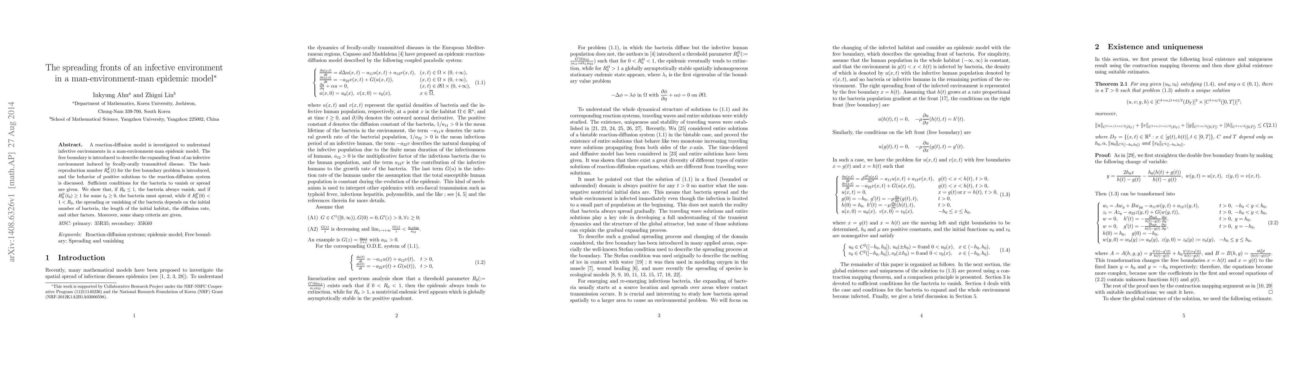 This paper investigates a reaction-diffusion model for a man-environment-man epidemic, focusing on the spreading front of an infective environment. It introduces a free boundary to describe the expansion of the infective area and provides conditions for the bacteria to either vanish or spread based on the basic reproduction number.