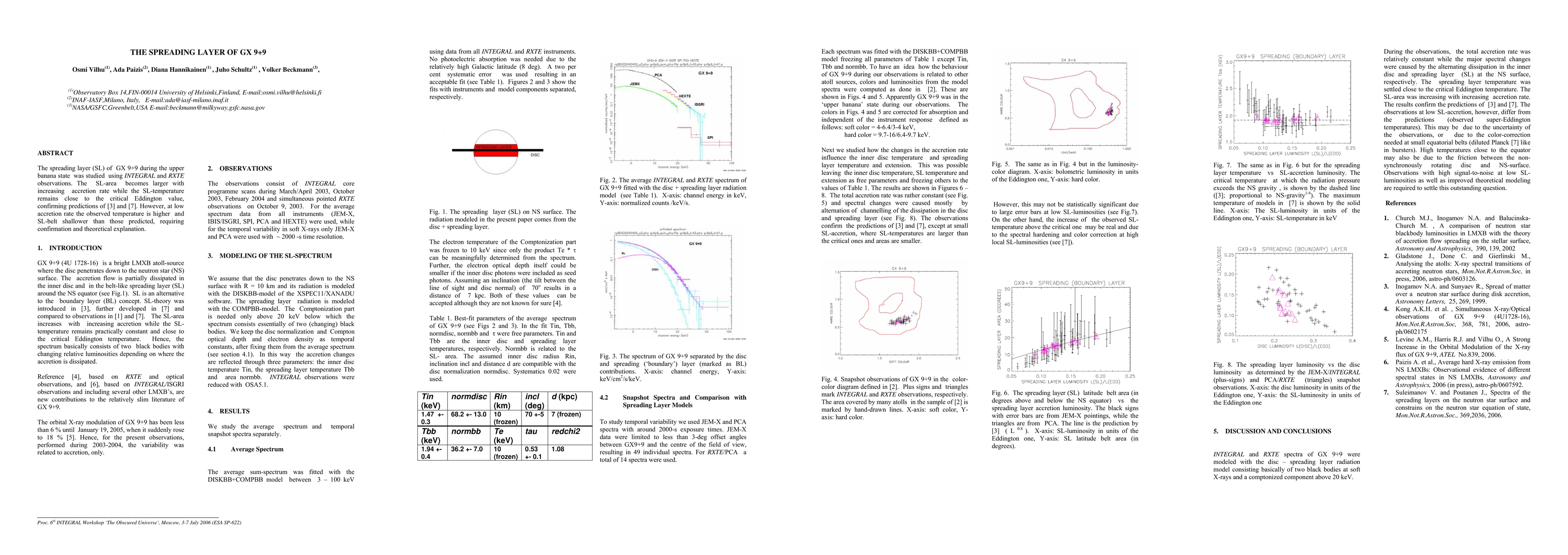 The spreading layer (SL) on neutron star surface of GX 9+9 during the upper banana state was studied using INTEGRAL and RXTE observations. The SL-area becomes larger with increasing accretion rate while the SL-temperature remains close to the critical Eddington value, confirming predictions by Inogamov and Sunyaev (1999) and Suleimanov and Poutanen (2006). However, at low accretion rate the observed temperature is higher and SL-belt shallower than those predicted, requiring confirmation and theoretical explananation.