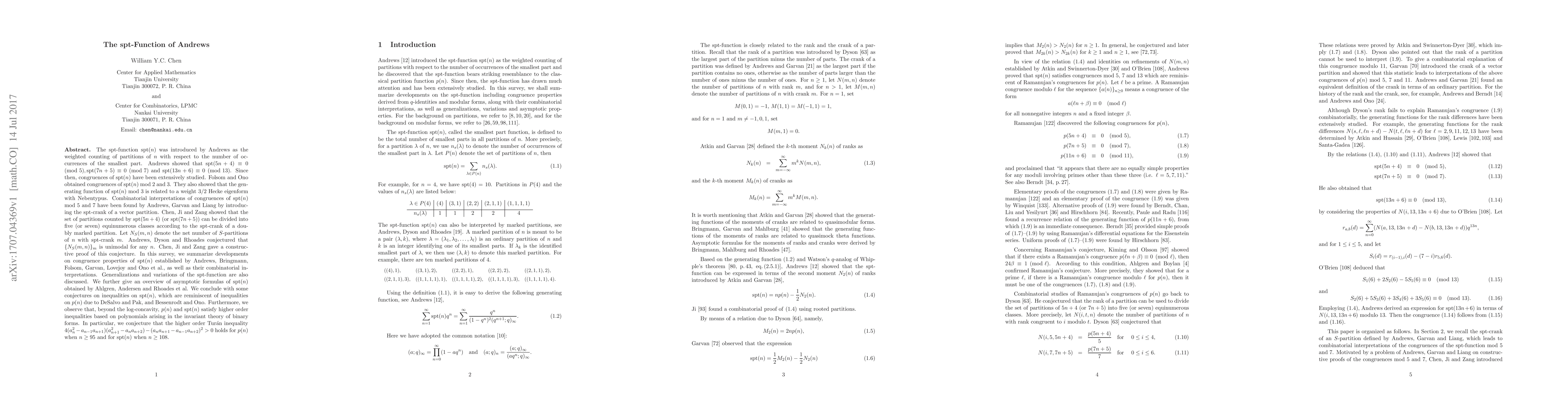 The spt-function spt($n$) was introduced by Andrews as the weighted counting of partitions of $n$ with respect to the number of occurrences of the smallest part. In this survey, we summarize recent developments in the study of spt($n$), including congruence properties established by Andrews, Bringmann, Folsom, Garvan, Lovejoy and Ono et al., a constructive proof of the Andrews-Dyson-Rhoades conjecture given by Chen, Ji and Zang, generalizations and variations of the spt-function. We also give an overview of asymptotic formulas of spt($n$) obtained by Ahlgren, Andersen and Rhoades et al. We conclude with some conjectures on inequalities on spt($n$), which are reminiscent of those on $p(n)$ due to DeSalvo and Pak, and Bessenrodt and Ono. Furthermore, we observe that, beyond the log-concavity, $p(n)$ and spt($n$) satisfy higher order inequalities based on polynomials arising in the invariant theory of binary forms. In particular, we conjecture that the higher order Tur\'{a}n inequality $4(a_n^2-a_{n-1}a_{n+1})(a_{n+1}^2-a_{n}a_{n+2})-(a_na_{n+1}-a_{n-1}a_{n+2})^2>0$ holds for $p(n)$ when $n\geq 95$ and for spt($n$) when $n\geq 108$.
