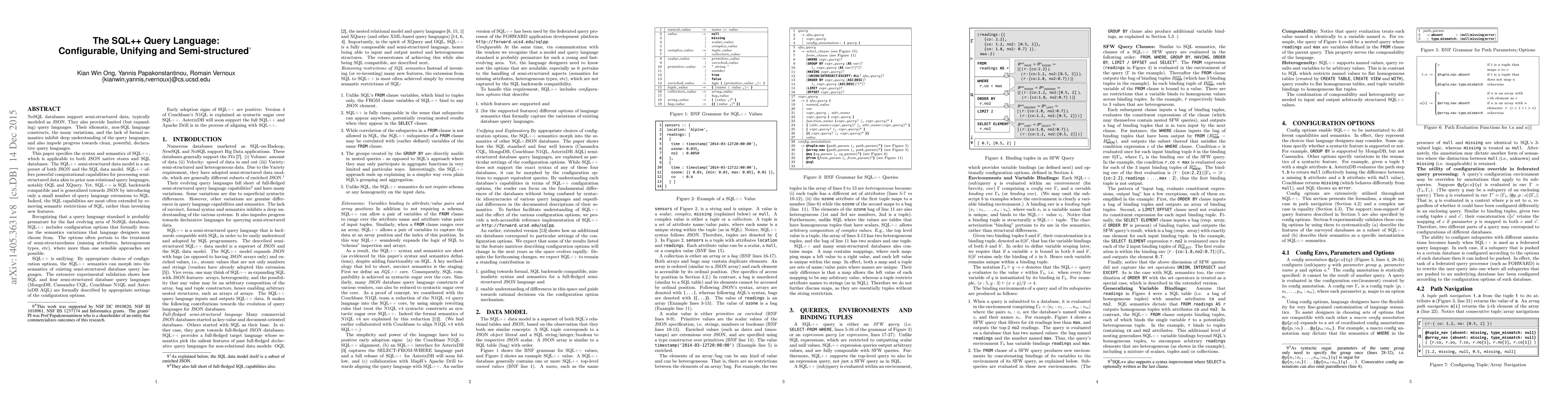 This paper introduces SQL++, a configurable, unifying, and semi-structured query language that extends SQL to handle JSON native stores and SQL databases. It offers powerful query capabilities while maintaining SQL backward compatibility and includes configuration options for handling semi-structured data variations.