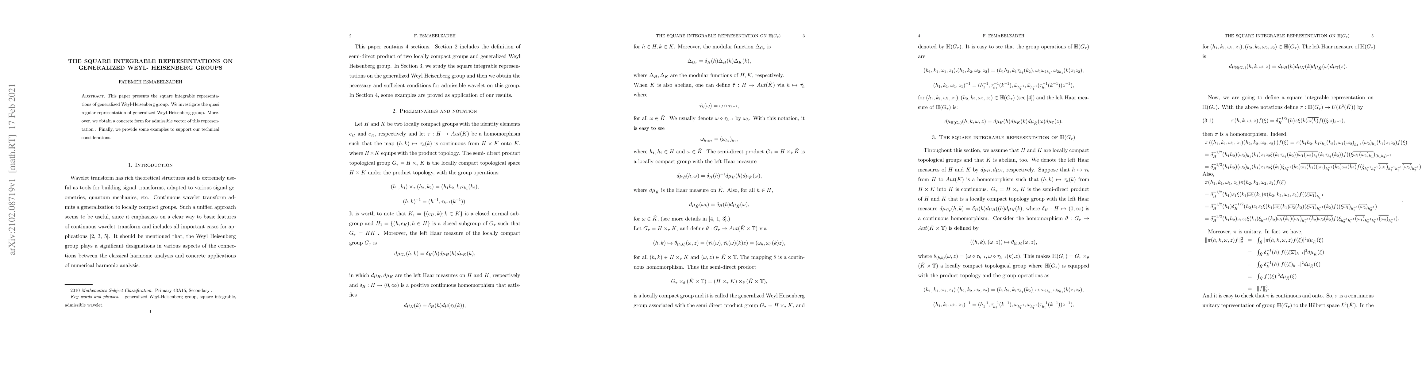 This paper explores square integrable representations of generalized Weyl-Heisenberg groups, focusing on quasi regular representations and deriving a concrete form for admissible vectors, supplemented by supporting examples.