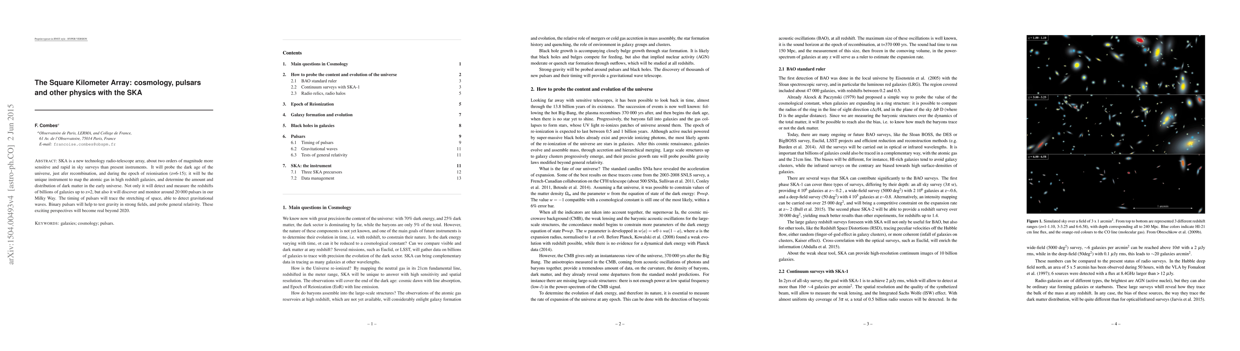 SKA is a new technology radio-telescope array, about two orders of magnitude more sensitive and rapid in sky surveys than present instruments. It will probe the dark age of the universe, just afer recombination, and during the epoch of reionisation (z=6-15); it will be the unique instrument to map the atomic gas in high redshift galaxies, and determine the amount and distribution of dark matter in the early universe. Not only it will detect and measure the redshifts of billions of galaxies up to z=2, but also it will discover and monitor around 20 000 pulsars in our Milky Way. The timing of pulsars will trace the stretching of space, able to detect gravitational waves. Binary pulsars will help to test gravity in strong fields, and probe general relativity. These exciting perspectives will become real beyond 2020.