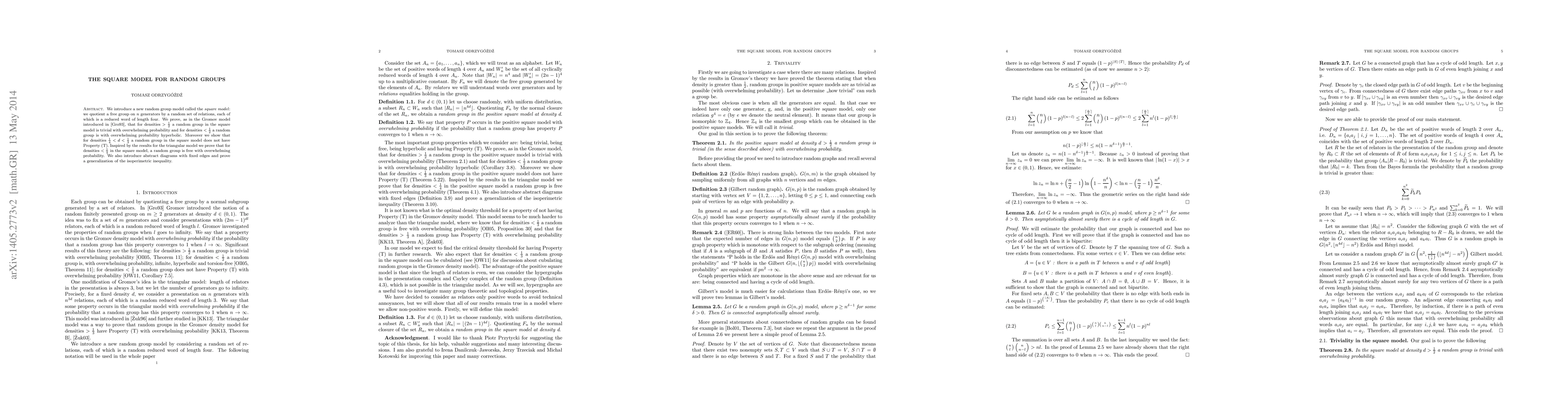 We introduce a new random group model called the square model: we quotient a free group on $n$ generators by a random set of relations, each of which is a reduced word of length four. We prove, as in the Gromov density model, that for densities $> \frac{1}{2}$ a random group in the square model is trivial with overwhelming probability and for densities $<\frac{1}{2}$ a random group is with overwhelming probability hyperbolic. Moreover we show that for densities $\frac{1}{4} < d < \frac{1}{3}$ a random group in the square model does not have Property (T). Inspired by the results for the triangular model we prove that for densities $<\frac{1}{4}$ in the square model, a random group is free with overwhelming probability. We also introduce abstract diagrams with fixed edges and prove a generalization of the isoperimetric inequality.