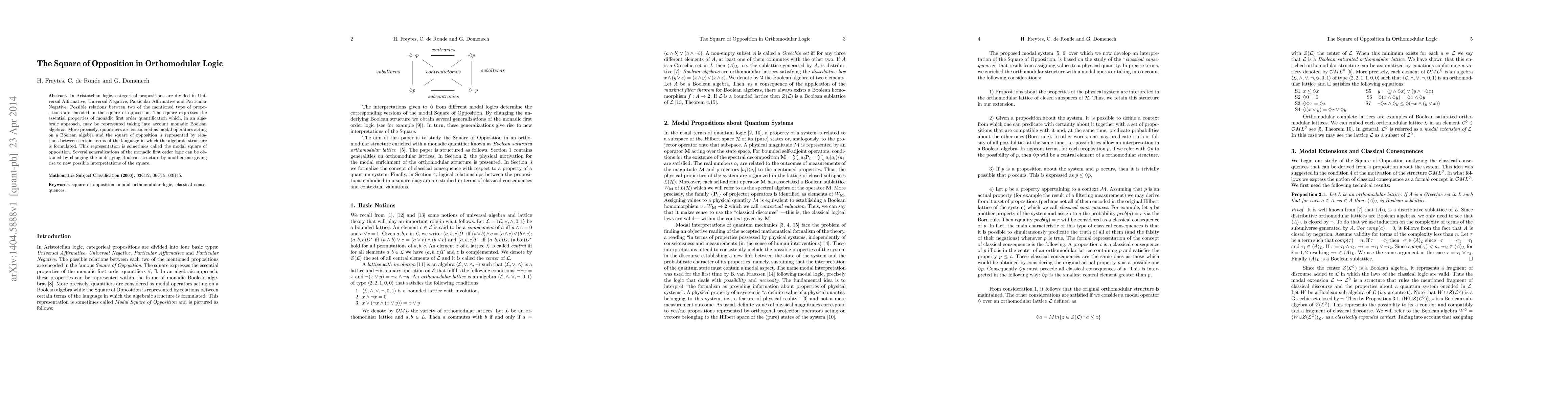 The square of opposition in orthomodular logic represents possible relations between categorical propositions as modal operators on a Boolean algebra, enabling various generalizations of monadic first order logic.
