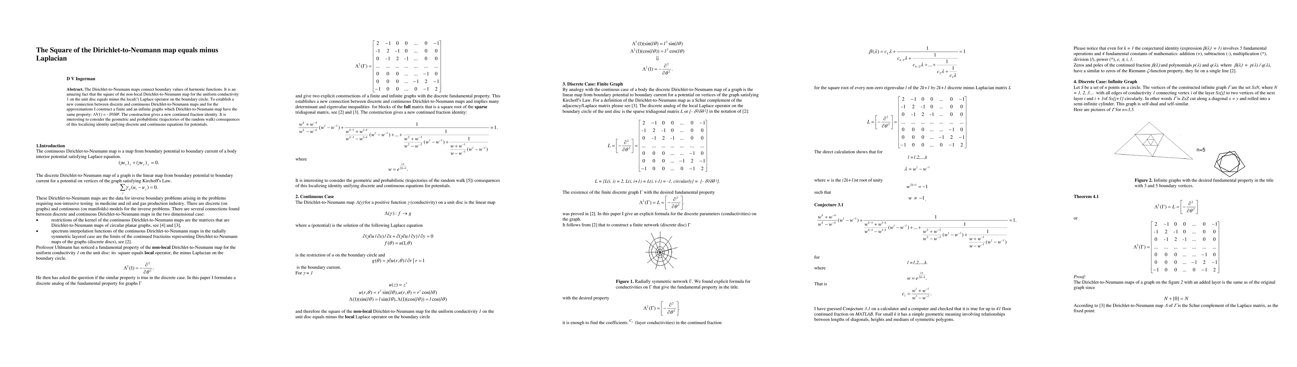 This paper demonstrates that the square of the Dirichlet-to-Neumann map for uniform conductivity on a unit disc equals the negative Laplace operator on the boundary, establishing a novel link between discrete and continuous Dirichlet-to-Neumann maps and yielding a new continued fraction identity with geometric and probabilistic implications.