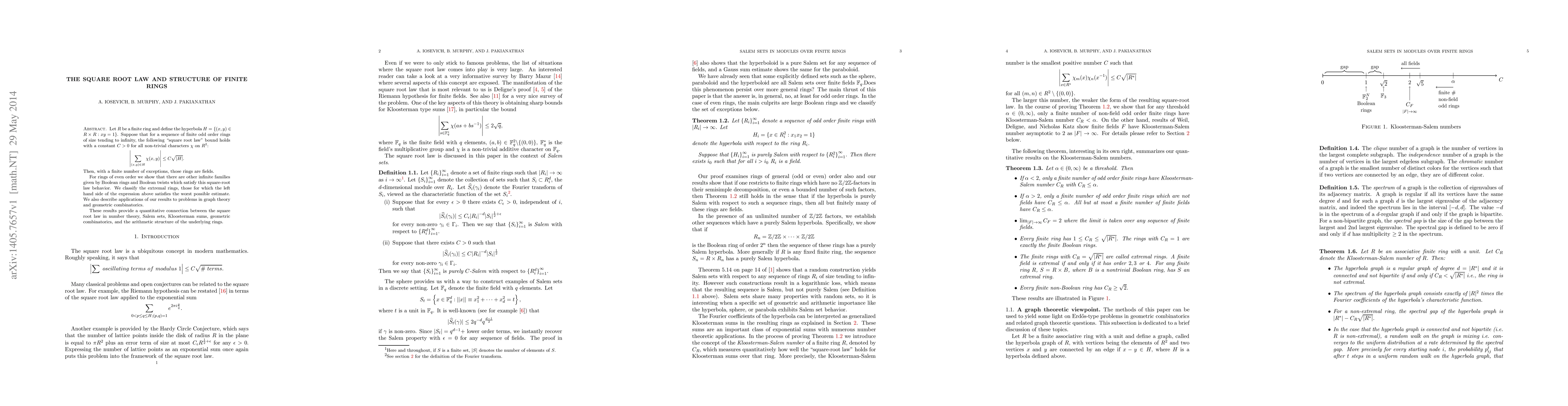 Let $R$ be a finite ring and define the hyperbola $H=\{(x,y) \in R \times R: xy=1 \}$. Suppose that for a sequence of finite odd order rings of size tending to infinity, the following "square root law" bound holds with a constant $C>0$ for all non-trivial characters $\chi$ on $R^2$: \[ \left| \sum_{(x,y)\in H}\chi(x,y)\right|\leq C\sqrt{|H|}. \] Then, with a finite number of exceptions, those rings are fields. For rings of even order we show that there are other infinite families given by Boolean rings and Boolean twists which satisfy this square-root law behavior. We classify the extremal rings, those for which the left hand side of the expression above satisfies the worst possible estimate. We also describe applications of our results to problems in graph theory and geometric combinatorics. These results provide a quantitative connection between the square root law in number theory, Salem sets, Kloosterman sums, geometric combinatorics, and the arithmetic structure of the underlying rings.