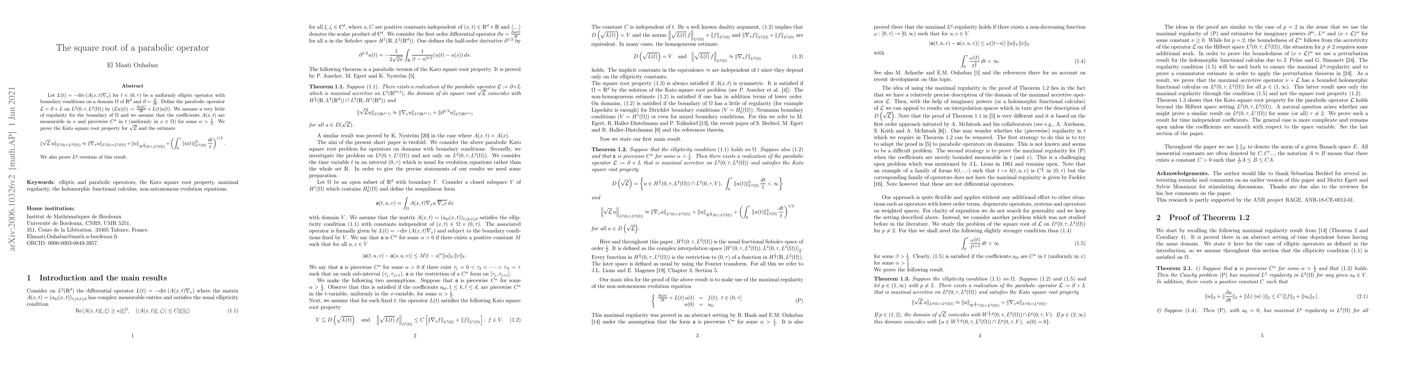 Let L(t) = --div (A(x, t)$\nabla$ x) for t $\in$ (0, $\tau$) be a uniformly elliptic operator with boundary conditions on a domain $\Omega$ of R d and $\partial$ = $\partial$ $\partial$t. Define the parabolic operator L = $\partial$ + L on L 2 (0, $\tau$, L 2 ($\Omega$)) by (Lu)(t) := $\partial$u(t) $\partial$t + L(t)u(t). We assume a very little of regularity for the boundary of $\Omega$ and assume that the coefficients A(x, t) are measurable in x and piecewise C $\alpha$ in t for some $\alpha$ > 1 2. We prove the Kato square root property for $\sqrt$ L and the estimate $\sqrt$ L u L 2 (0,$\tau$,L 2 ($\Omega$)) $\approx$ $\nabla$ x u L 2 (0,$\tau$,L 2 ($\Omega$)) + u H 1 2 (0,$\tau$,L 2 ($\Omega$)) + $\tau$ 0 u(t) 2 L 2 ($\Omega$) dt t 1/2. We also prove L p-versions of this result. Keywords: elliptic and parabolic operators, the Kato square root property, maximal regularity, the holomorphic functional calculus, non-autonomous evolution equations.