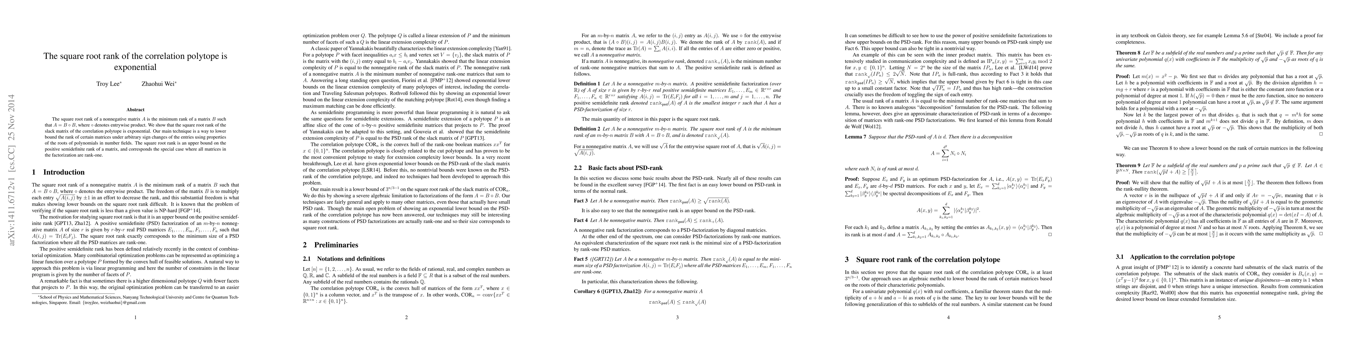 This paper demonstrates that the square root rank of the slack matrix of the correlation polytope is exponential. The authors achieve this by developing a method to lower bound matrix rank under arbitrary sign changes, leveraging properties of polynomial roots in number fields.