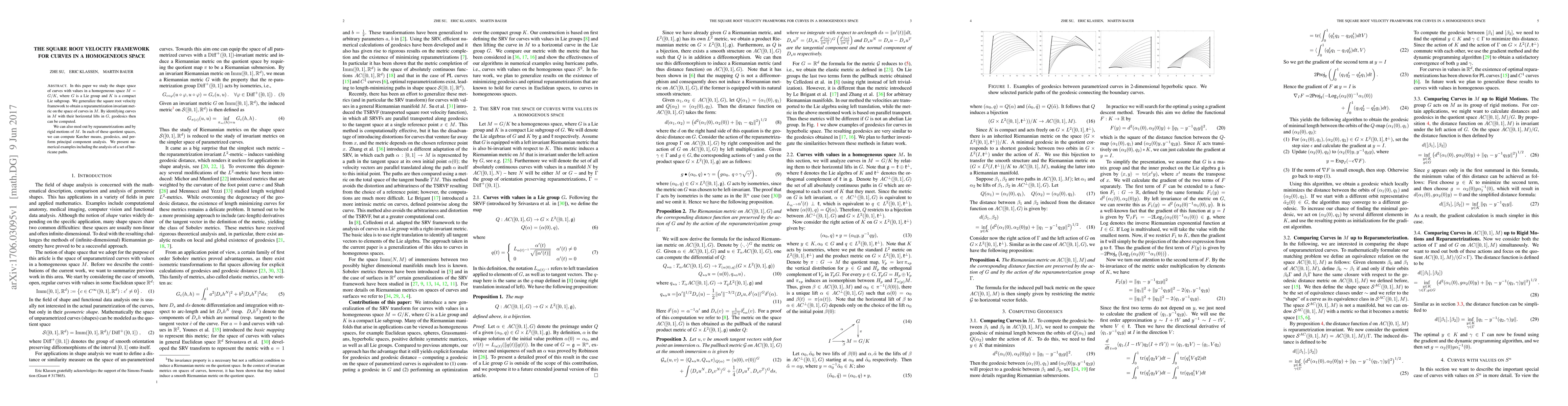 The paper generalizes the square root velocity framework to obtain a reparametrization-invariant metric on the space of curves in a homogeneous space M = G/K, where G is a Lie group and K is a compact Lie subgroup. It identifies curves in M with their horizontal lifts in G, enabling geodesic computation and modding out by reparametrizations and rigid motions of M.