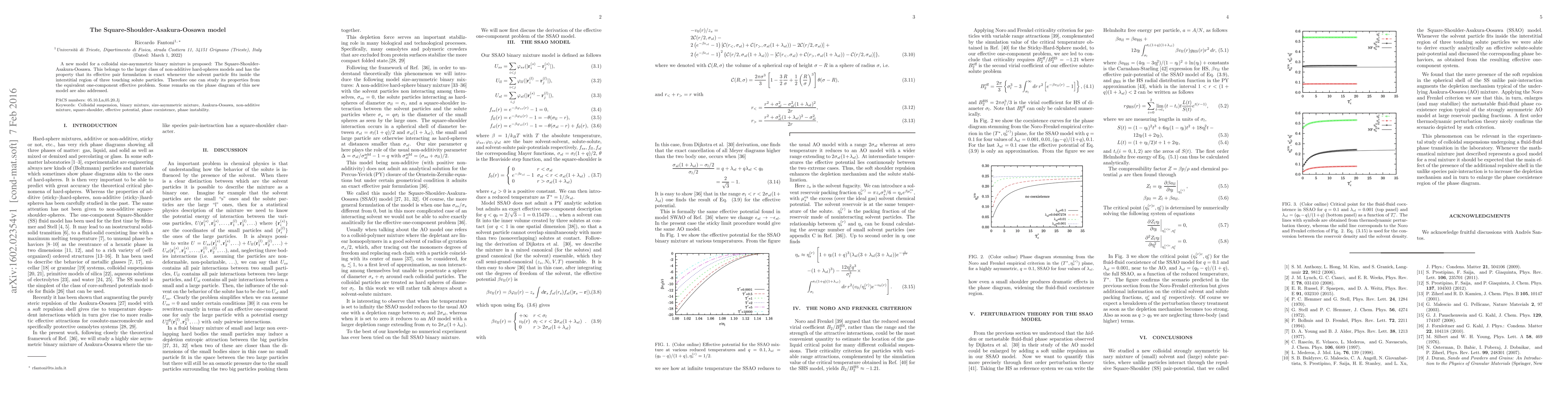 The Square-Shoulder-Asakura-Oosawa model proposes a new framework for studying colloidal size-asymmetric binary mixtures, offering an exact effective pair formulation under specific geometric conditions. The model's phase diagram is briefly discussed, providing insights into the system's behavior.