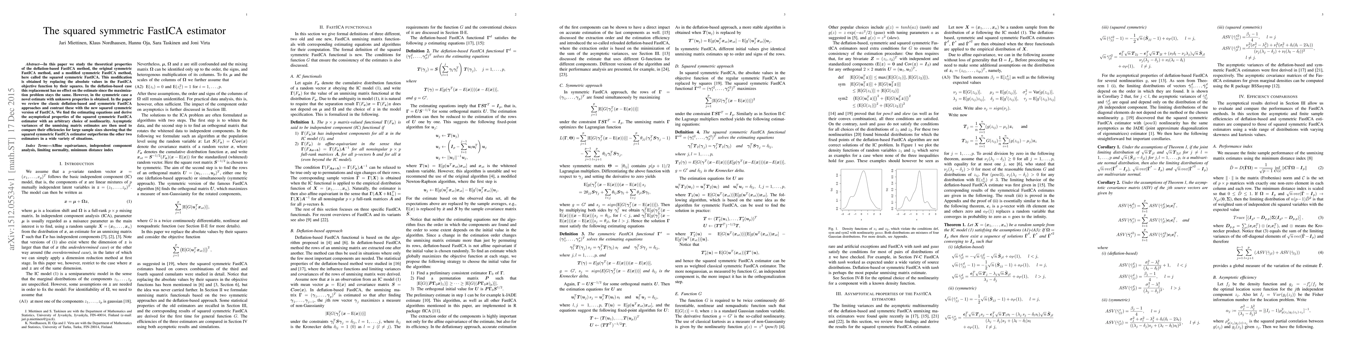 This paper investigates the theoretical properties of three FastICA methods: deflation-based, original symmetric, and a new squared symmetric FastICA. The squared symmetric version modifies the original by squaring absolute values in the objective function, leading to novel estimates with improved efficiency for large sample sizes.