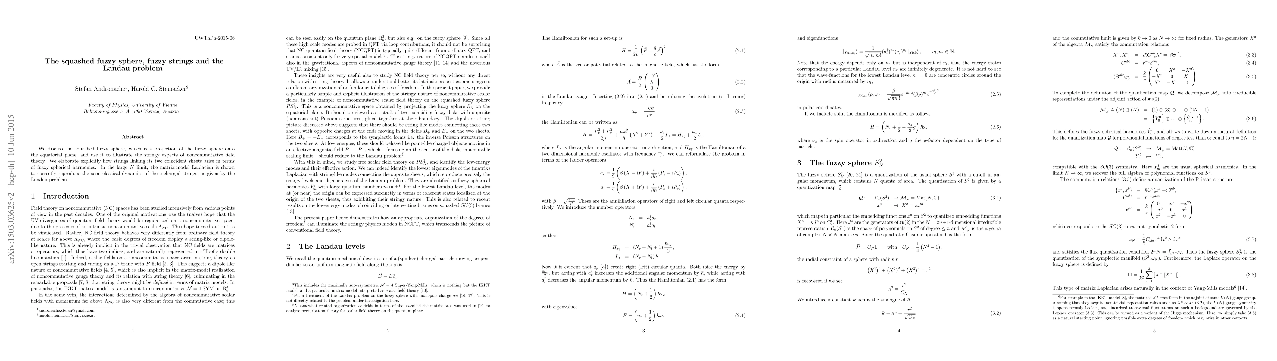 The paper presents a detailed analysis of the matrix Laplacian on the squashed fuzzy sphere and its relation to the Landau problem, providing a concrete example of string-like behavior in noncommutative field theory.