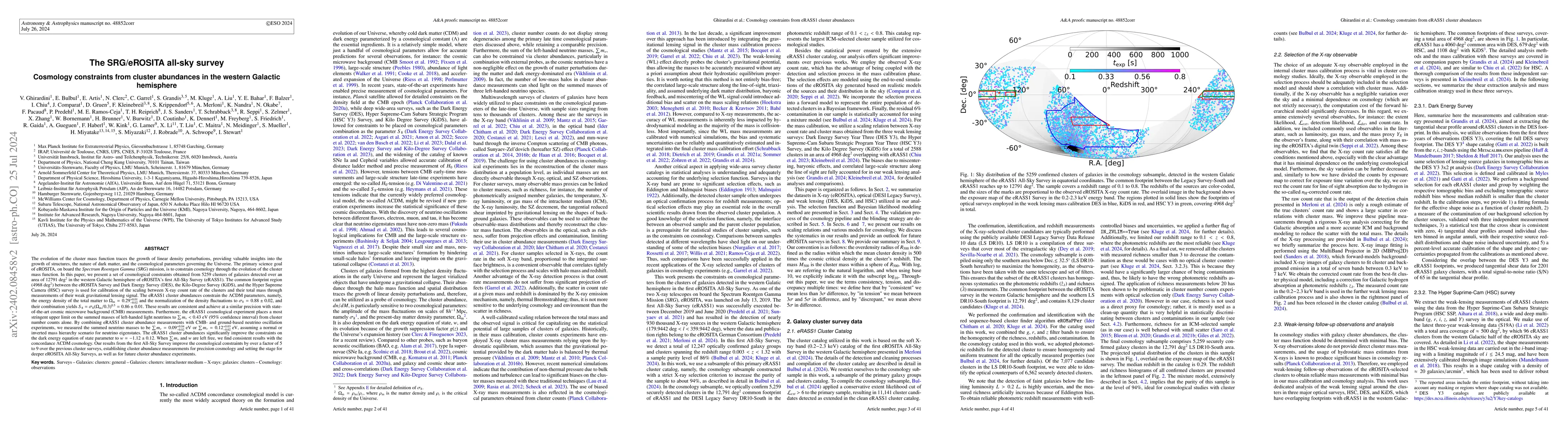 The eROSITA All-Sky Survey detected 5259 galaxy clusters in the Western Galactic Hemisphere, providing cosmological constraints that refine $\Lambda$CDM parameters and limit neutrino masses. The survey's cluster abundances yield $\Omega_{\mathrm{m}}=0.29^{+0.01}_{-0.02}$, $\sigma_8=0.88\pm0.02$, and $S_8=0.86\pm0.01$, consistent with the latest CMB measurements.