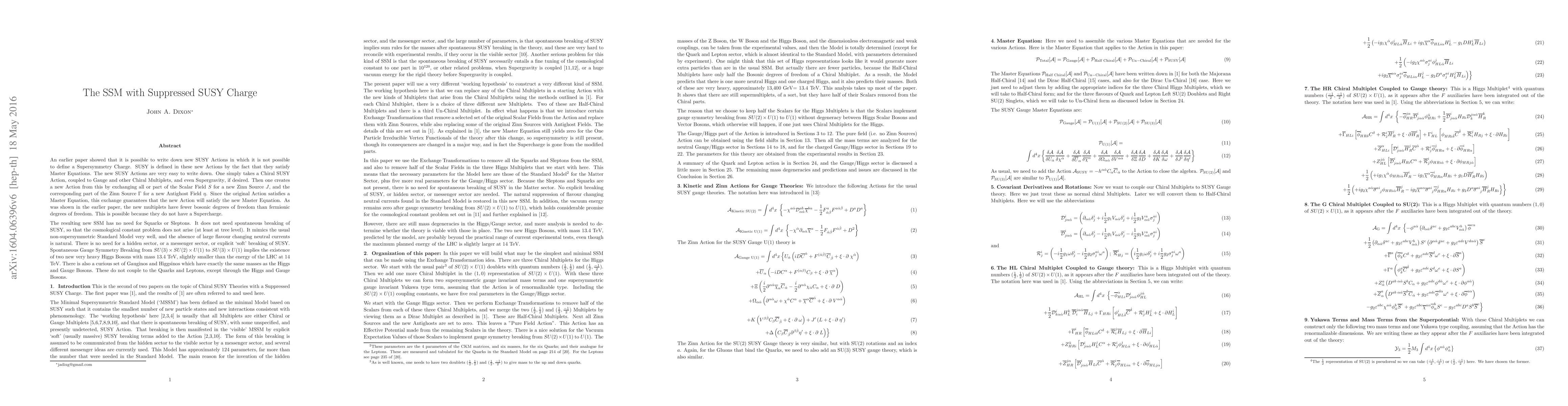 An earlier paper showed that it is possible to write down new SUSY Actions in which it is not possible to define a Supersymmetry Charge. SUSY is defined in these new Actions by the fact that they satisfy Master Equations. The new SUSY Actions are very easy to write down. One simply takes a Chiral SUSY Action, coupled to Gauge and other Chiral Multiplets, and even SuperGravity, if desired. Then one creates a new Action from this by exchanging all or part of the Scalar Field $S$ for a new Zinn Source $J$, and the corresponding part of the Zinn Source $\Gamma$ for a new Antighost Field $\eta$. Since the original Action satisfies a Master Equation, this exchange guarantees that the new Action will satisfy the new Master Equation. As was shown in the earlier paper, the new multiplets have fewer bosonic degrees of freedom than fermionic degrees of freedom. This is possible because they do not have a Supercharge. The resulting new SSM has no need for Squarks or Sleptons. It does not need spontaneous breaking of SUSY, so that the cosmological constant problem does not arise (at least at tree level). It mimics the usual non-supersymmetric Standard Model very well, and the absence of large flavour changing neutral currents is natural. There is no need for a hidden sector, or a messenger sector, or explicit `soft' breaking of SUSY. Spontaneous Gauge Symmetry Breaking implies the existence of two new very heavy Higgs Bosons with mass 13.4 TeV, slightly smaller than the energy of the LHC at 14 TeV. There is also a curious set of Gauginos and Higgsinos which have exactly the same masses as the Higgs and Gauge Bosons. These do not couple to the Quarks and Leptons, except through the Higgs and Gauge Bosons.