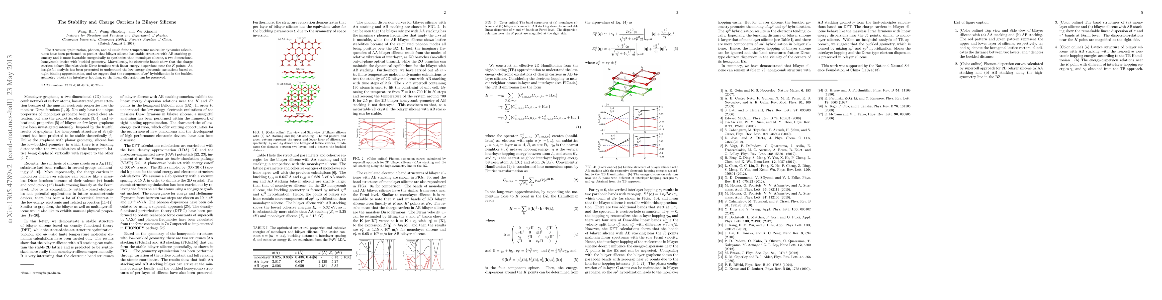 Bilayer silicene with AB stacking geometry is predicted to be stable and more energetically favorable than monolayer silicene. Its electronic bands exhibit charge carriers behaving like relativistic Dirac fermions with linear energy dispersions.