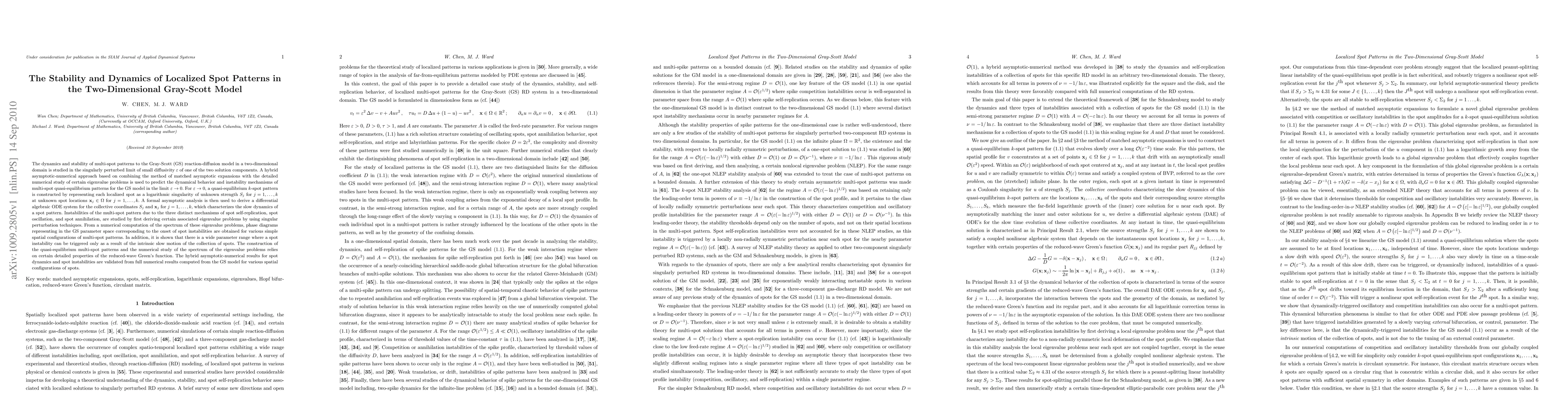 Researchers studied the dynamics of localized spot patterns in a 2D reaction-diffusion model, predicting instability mechanisms and phase diagrams for various spatial configurations, highlighting a wide parameter range where spot instabilities can be triggered by slow motion of individual spots.