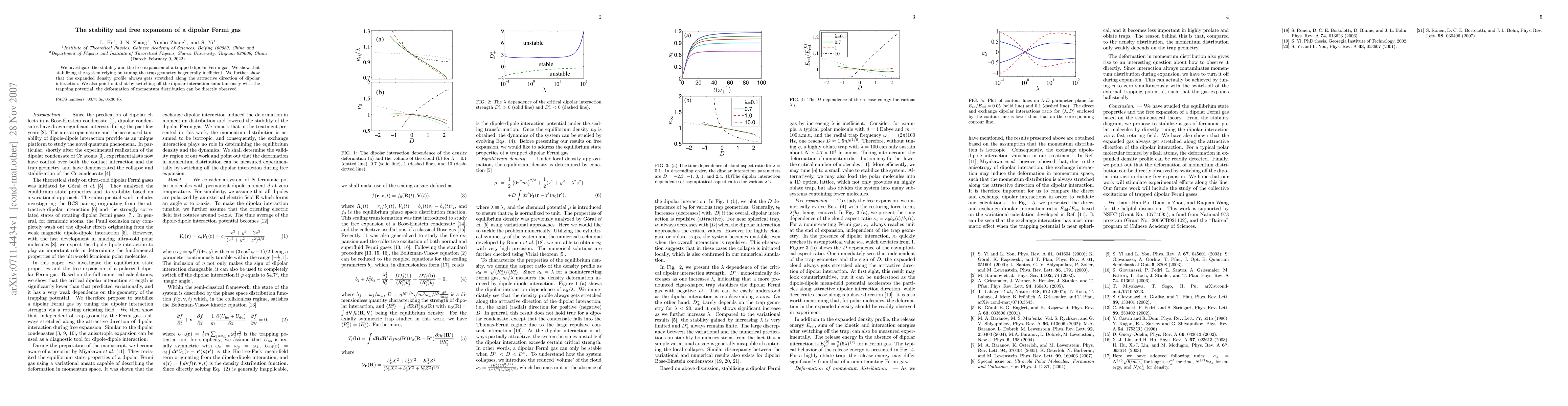 This study examines the stability and free expansion of a trapped dipolar Fermi gas, revealing that adjusting trap geometry for stabilization is ineffective. The research also demonstrates that the density profile elongates along the attractive dipolar interaction direction during free expansion, and highlights the observable deformation in momentum distribution when both dipolar interaction and trapping potential are simultaneously switched off.