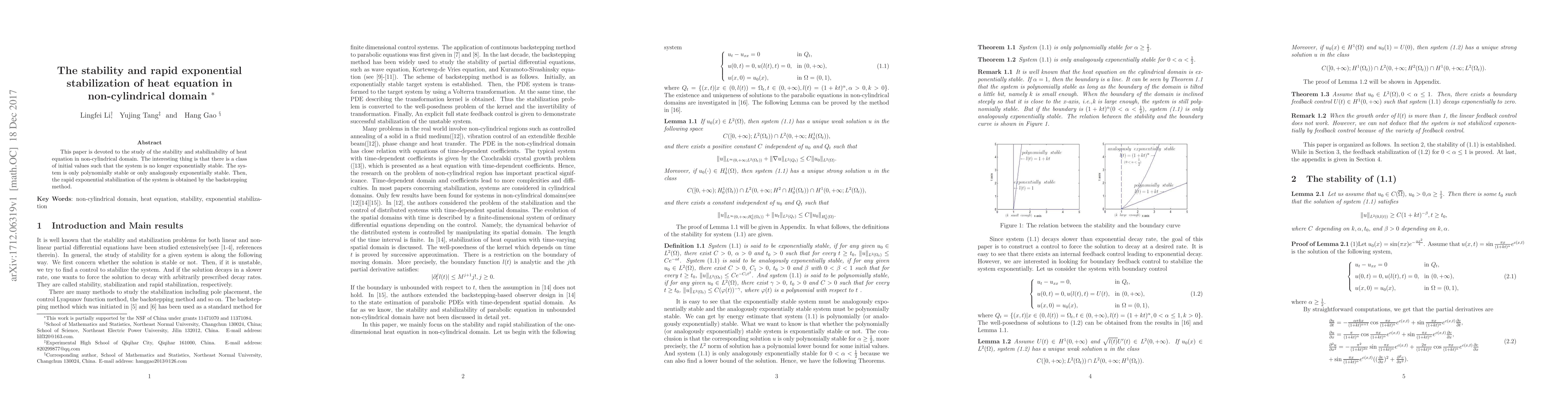 This paper investigates the stability and stabilizability of heat equations in non-cylindrical domains, revealing that certain initial conditions lead to non-exponential stability. Rapid exponential stabilization is achieved through the backstepping method.