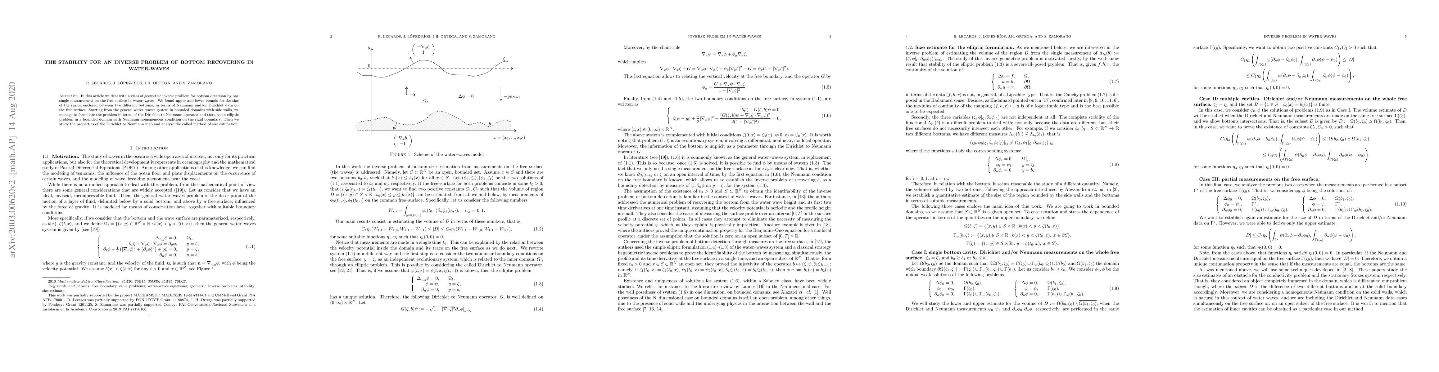 In this article we deal with a class of geometric inverse problem for bottom detection by one single measurement on the free surface in water--waves. We found upper and lower bounds for the size of the region enclosed between two different bottoms, in terms of Neumann and/or Dirichlet data on the free surface. Starting from the general water--waves system in bounded domains with side walls, we manage to formulate the problem in terms of the Dirichlet to Neumann operator and thus, as an elliptic problem in a bounded domain with Neumann homogeneous condition on the rigid boundary. Then we study the properties of the Dirichlet to Neumann map and analyze the called method of size estimation.