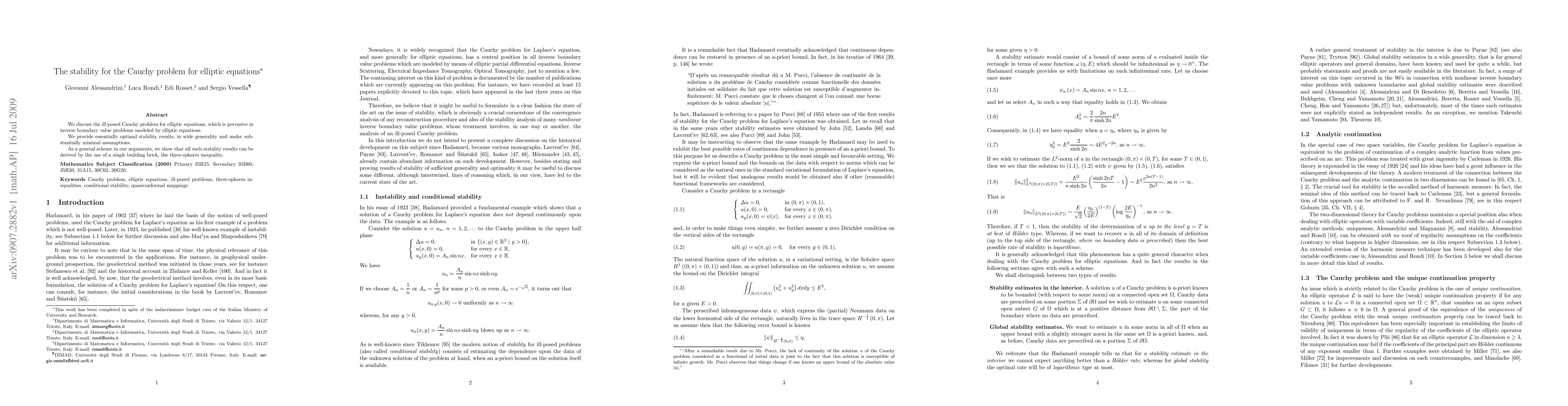 This paper addresses the ill-posed Cauchy problem for elliptic equations, common in inverse boundary value problems. It presents optimal stability results under minimal assumptions, utilizing the three-spheres inequality as a fundamental tool.