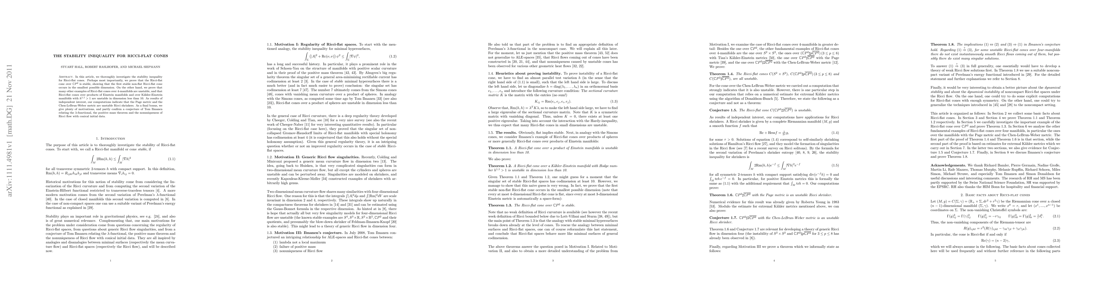 In this article, we thoroughly investigate the stability inequality for Ricci-flat cones. Perhaps most importantly, we prove that the Ricci-flat cone over CP^2 is stable, showing that the first stable non-flat Ricci-flat cone occurs in the smallest possible dimension. On the other hand, we prove that many other examples of Ricci-flat cones over 4-manifolds are unstable, and that Ricci-flat cones over products of Einstein manifolds and over Kahler-Einstein manifolds with h^(1,1)>1 are unstable in dimension less than 10. As results of independent interest, our computations indicate that the Page metric and the Chen-LeBrun-Weber metric are unstable Ricci shrinkers. As a final bonus, we give plenty of motivations, and partly confirm a conjecture of Tom Ilmanen relating the lambda-functional, the positive mass theorem and the nonuniqueness of Ricci flow with conical initial data.